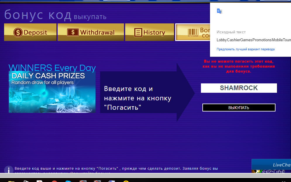 Заходи на https://casino.my , видимо ты еще со старого домена заходишь! а код SHAMROCK, вводить в кассе