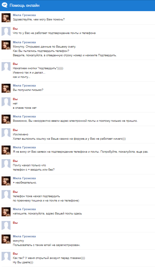 ser7217 написал(а): Посмотреть вложение 43519 У меня в профиле не подтверждались почта и телефон.Удалось сделать это только через чат. Беседа с оператором заслуживает отдельного внимания))) практически детектив)))иронический) Посмотреть вложение 43520 Посмотреть вложение 43521 Посмотреть вложение 43522 Посмотреть вложение 43523 https://vulcangalaxy.com/promo/10-frispinov Нажмите для раскрытия... Ха, прикольный диалог) Ты с Владивостока?)
