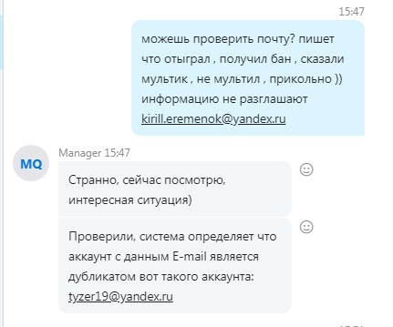 Бред полнейший =))) вот смысл врать мне ? если б мультил то просто бы закрыл нахрен страницу и всё запил водой , на яндексе единственная почта моя та которая пару постами выше , больше там почт не имею , я им пытался обьяснить что это может быть связано с VPN т.к играл с ним и без него , но никто меня не слушает , пусть пробивают айпишник или ещё что хотят , но это полный бредответ манагера