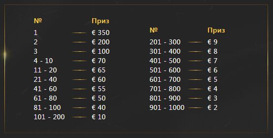 В каждой гонке 1000 победителей. Ими становятся игроки, набравшие наибольшее количество очков за период проведения гонки. Призовые места распределяются в соответствии с итоговой таблицей. Все призы — реальные деньги, которые будут начислены на Ваш счет в течение 24 часов после окончания гонки.