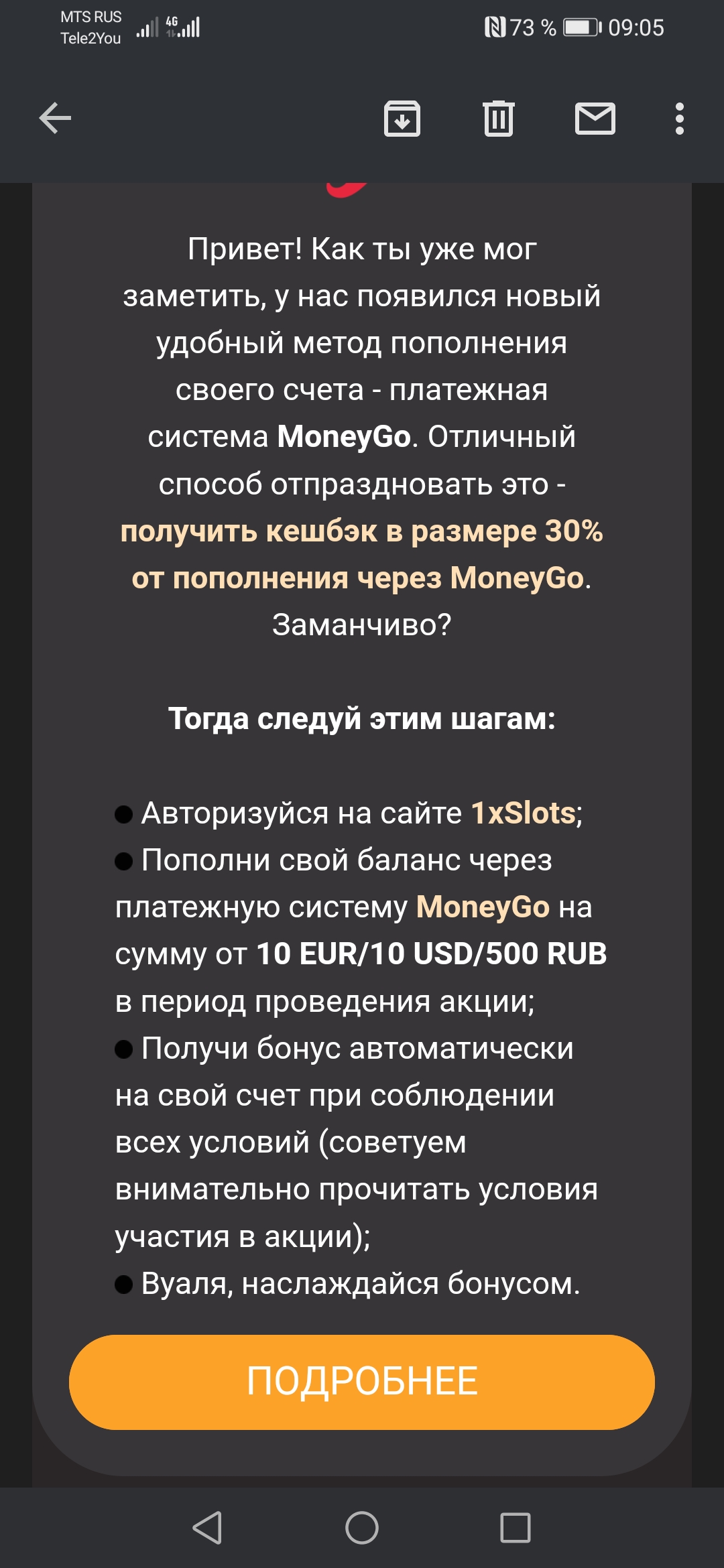 10. Предложение не может быть использовано в комбинации с другими акциями или специальными предложениями. Приветственные бонусы на депозит, а также постоянные бонусные предложения имеют приоритетное значение: если вы претендуете, например, на бонус понедельника, то бонус за пополнение через MoneyGo не будет начислен.