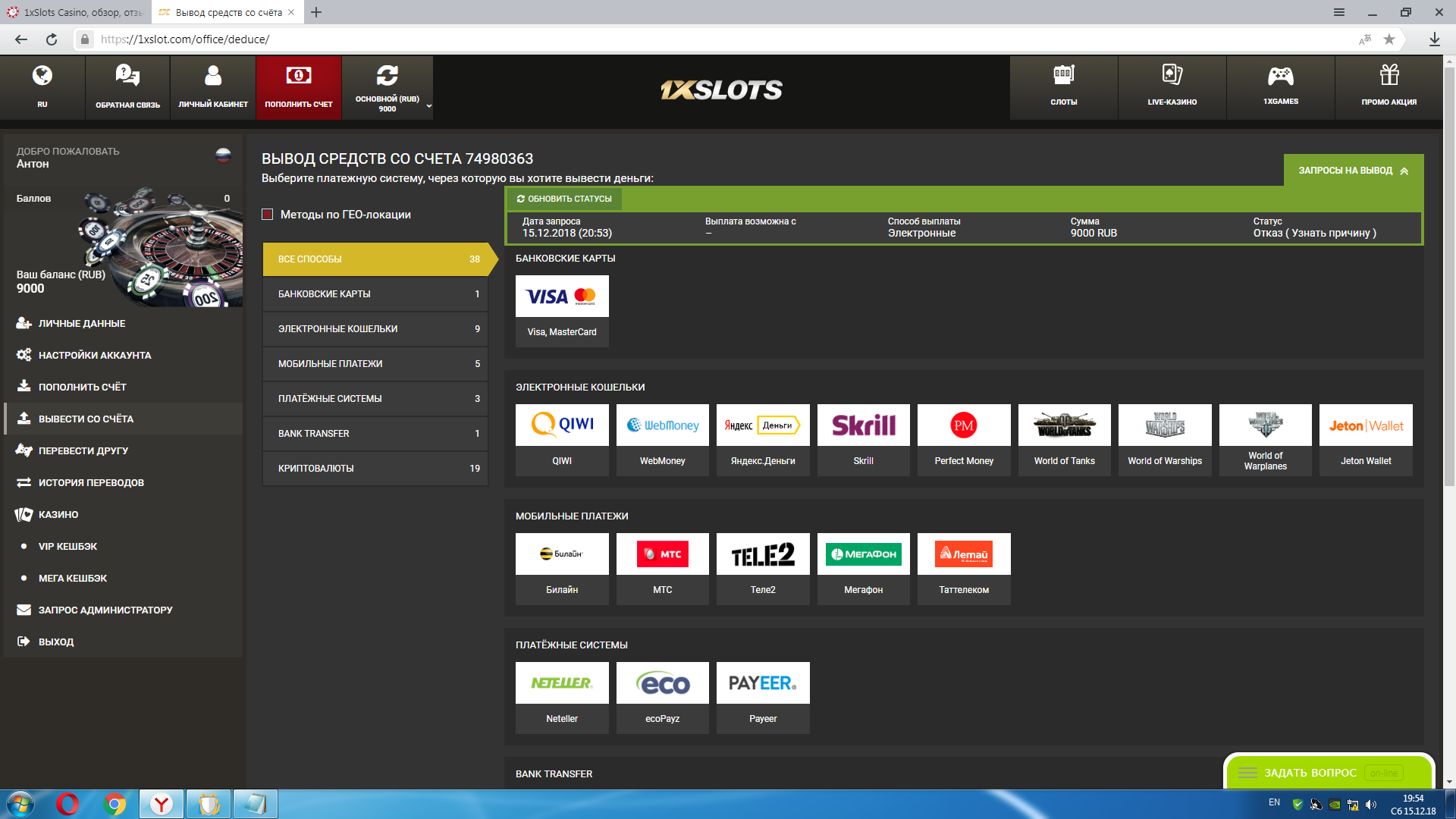 В принципе я другого ответа от платформы 1Х и не ожидал,очередная ветвь мошенничества,если я даже бонусы удалил и просто выиграл на свои деньги на лайв дилере и аккаунт заблокирован итог-не проиграть и не выплатить,а Ваши отнекивания по поводу предоставления документов от паспорта на фоне лица и до справки что я не лудоман я уже проходил,как Вы хотите сделать себе базу постоянных активных клиентов для меня остается загадкой и скрин для новичков что Вас ожидает при желании совершить вывод средств на платформе 1Х: