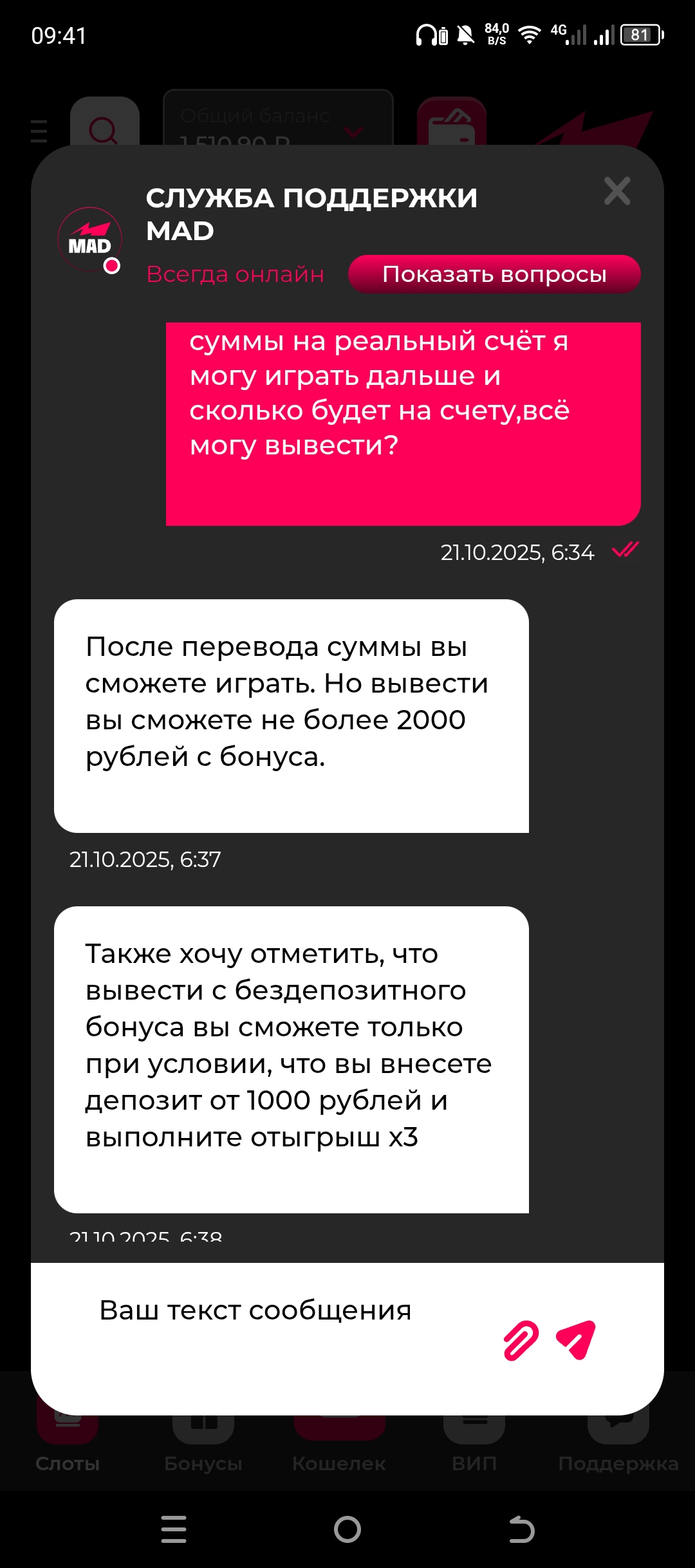 Отыгрыш вейджера доступен с реальным и бонусым балансом.