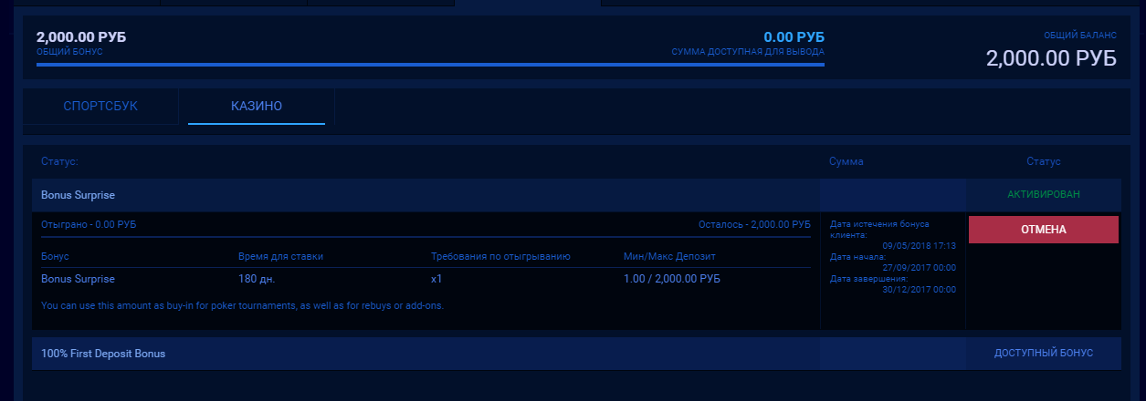 Вчера только пришло письмо на почту,бездеп на ставки. Ставки не нашел,нашел бонус покер на 2000. Не играл еще,но в туриках можно регистрироваться. Проверял: вход и выход )