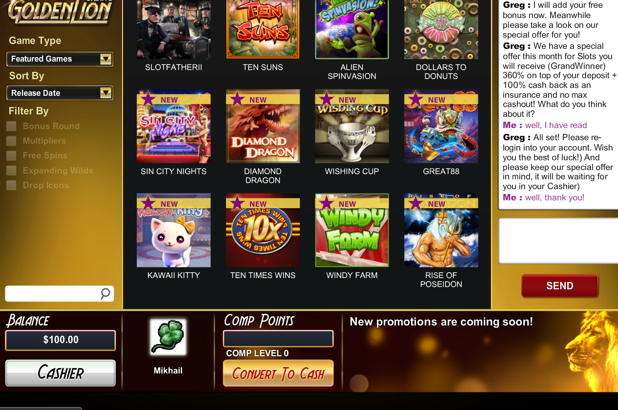 Бездеп 45$ в Golden Lion Casino