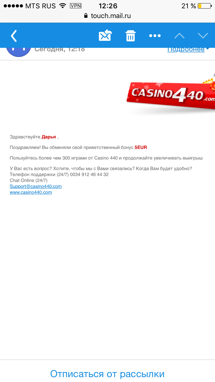 ZadiakBrnа просмотрел скрин, смотрю на русском языке письмо от них:) плюс сходу там поменял язык, не стал заморачиваться с гуглом, сразу на русском отправил им просьбу об начисления бездепа. Все там же кстати прочел "онлайн чат 24/7" но как ты и сказал чето в оффе. Помню недавно так же :) в betat casino письмо отправлял целое сочинение, потом перевел через гугл и после отправил, :) опупел когда получил ответ на все свои вопросы на русском языке, оказалось там есть русская поддержка :)