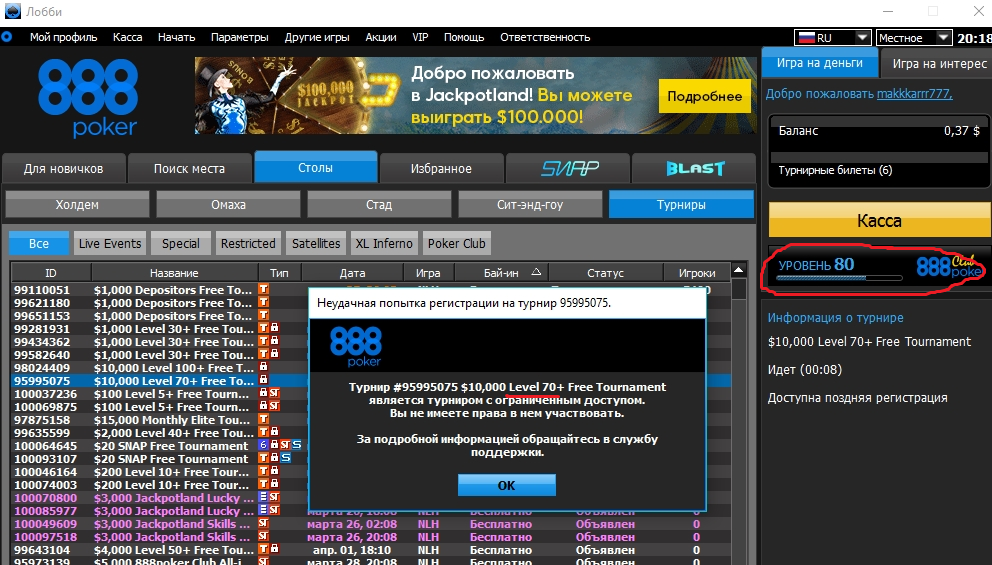Мы связываемся с Вами относительно трудностей, которых вы испытываете при входе в нашем турнире $10.000 Level 70+.