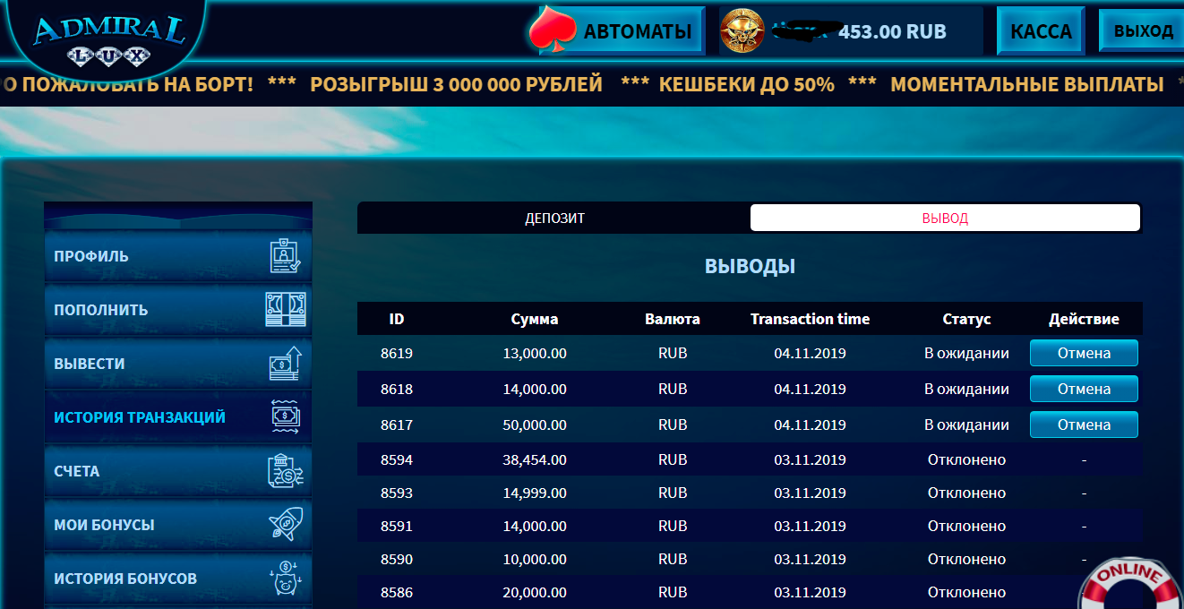 Увидел на сайте казино admirallux.vip. Сделал депозит 2000 рублей. получил бонусы,отыграл.