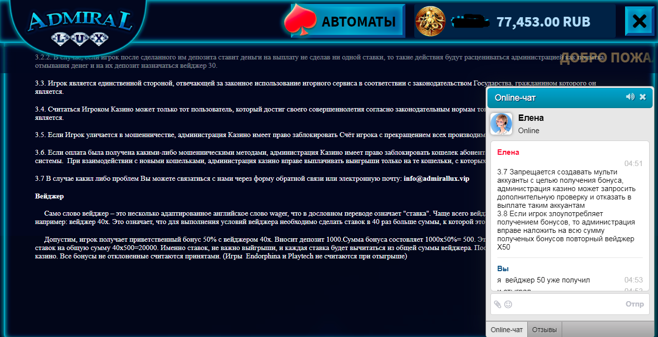 Отклонено Admirallux.vip не выплачивает 77000 рублей мульту