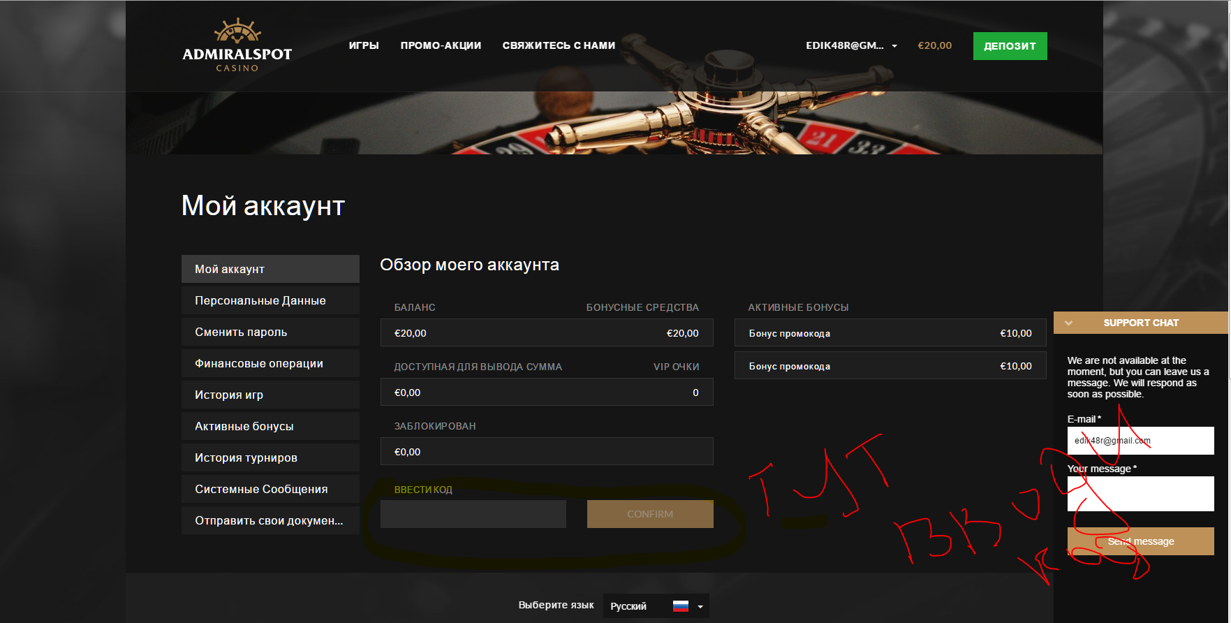 тут надо вводить? промо акции- вип бонус - ввести код? пишет неверный бонус код