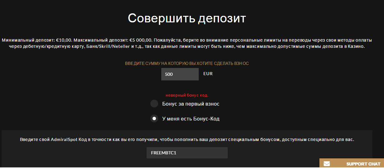 Регистрируемся здесь https://admiralspot.com/en/ ,потверждаем телефон .В разделе бонусы пишем EXBINO или FREEMBTC1 .Вагер 100 макс вывод 50usd/eur/mbtc