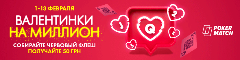 В феврале на PokerMatch пройдёт сразу две интересные акции: романтичная “Валентинки на миллион” с призовым фондом в 1 миллион гривен и уже полюбившаяся всем “Гриндомания”, которая разыграет призовой фонд 196,000 гривен.