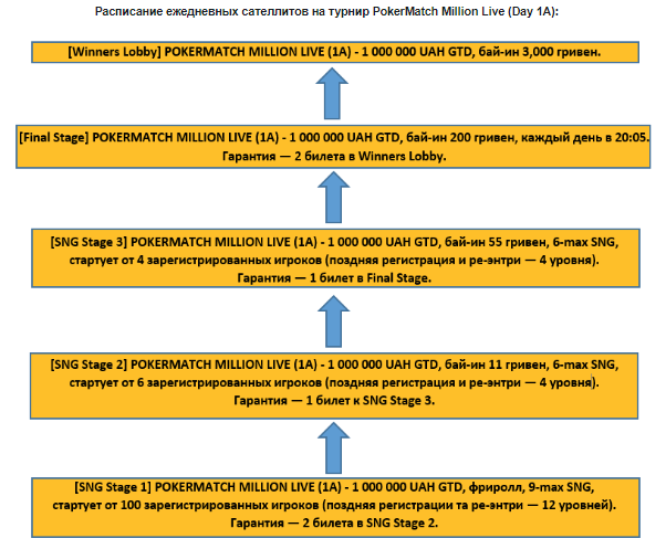 Отборочные онлайн-сателлиты на турнир PokerMatch Million Live (Day 1A) будут проходить ежедневно с 3 по 30 января. Начать свой отбор в турнир-миллионник можно бесплатно с фриролла или со stage 2 за 11 гривен, stage 3 за 55 гривен, а также с финального уровня — final stage с бай-ином 200 гривен.