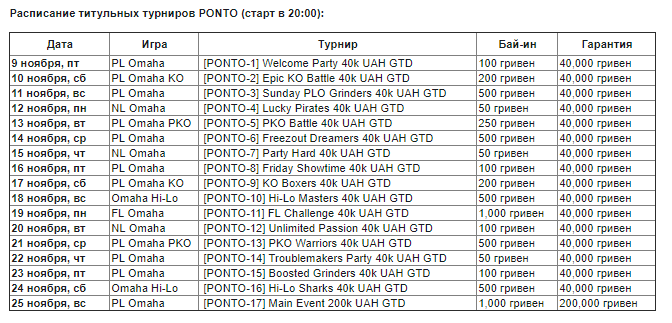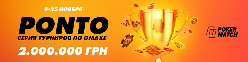 на PokerMatch пройдёт первая онлайн-серия турниров по Омахе PONTO с призовым фондом 2,000,000 гривен! В рамках серии будут проходить ежедневные регулярные турниры, а ещё вас ждёт 17 титульных турниров по Омахе в разных форматах (безлимитная, пот-лимитная, хай-лоу). Все бай-ины очень доступные и стартуют с 50 гривен!