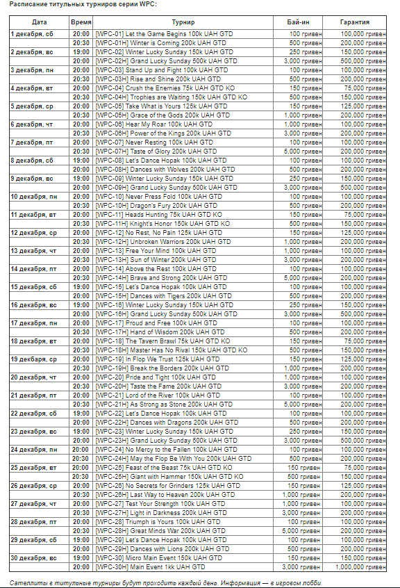 Серия завершится 30 декабря двумя Главными событиями: Micro Main Event с призовым фондом 150,000 гривен и Main Event с фондом в 1,000,000 гривен! На Main Event можно отобраться через ежедневные сателлиты, сэкономив на бай-ине, а также вы можете начать с фрироллов.