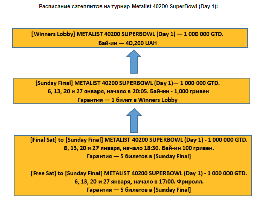 На турнир хaйроллеров Metalist 40200 SuperBowl онлайн-сателлиты будут проходить по воскресеньям в период с 6 по 27 января включительно. Также можно начать свой путь к заветному билету с фриролла или заплатив бай-ин 100 или 1,000 гривен (в зависимости от уровня).