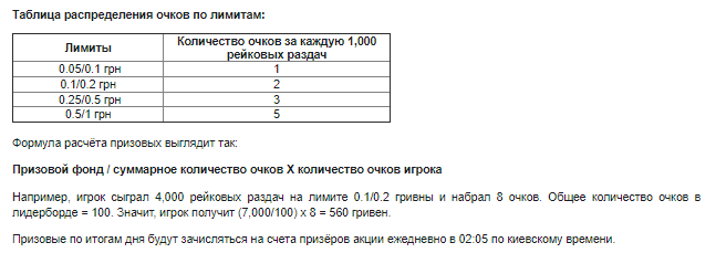 Просто играйте за кэш-столами безлимитного Холдема и Омахи и набивайте рейк! Всего будет 4 отдельных группы в зависимости от лимитов кэш игр, в которых отдельно будет идти зачёт очков, и самый минимальный лимит — 0.5/1 гривна. Существуют специальные множители и коэффициенты, которые увеличивают количество ваших баллов. Итоги гонки будут подведены 30 ноября и в каждой группе будет по 15 призовых мест — с призами от 1,000 до 110,000 гривен!
