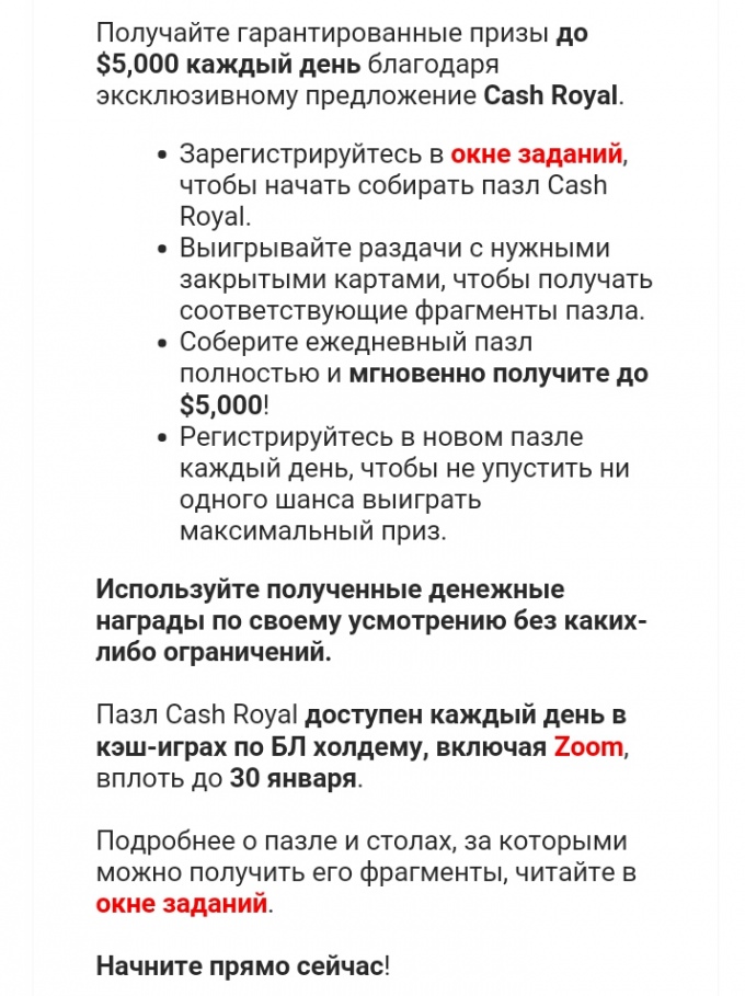 Откройте окно заданий на pokerstars clash royale. Нажмите старт. После этого играйте в обычные и Zoom кеш-игры по холдему (с любыми ставками, игры с фиксированным лимитом не учитываются,карты должны получить как минимум 3 игрока) За каждую раздачу, выигранную с нужной закрытой картой , Вы получите соответствующий фрагмент пазла . Соберите пазл полностью и получите денежный приз.