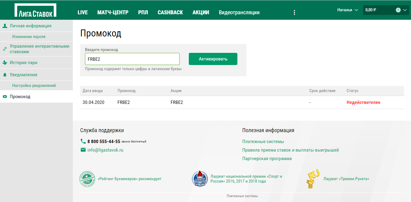 промокод на 300 рублей для Лиги ставок, условия вроде стандартные