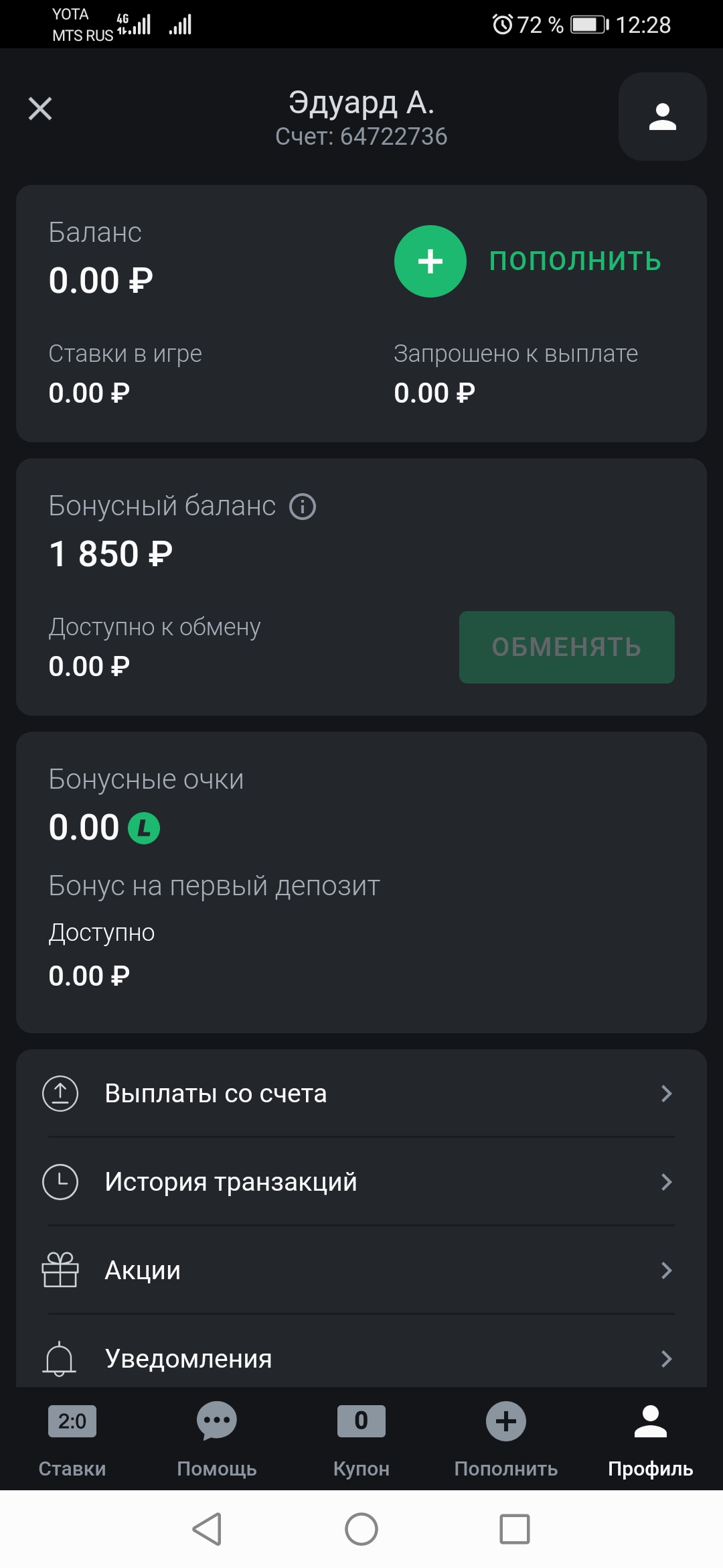 С фрибета выйгрыш весь Ваш, но нужна ставка с реального счета чтобы проиграла с кэфом 1.7 на 500 рублей. Так то норм, если и поиграю то 1350 все равно выведу.