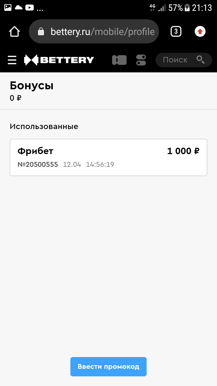 Bettery бездеп фрибет 1000 рублей,за регисрацию.необходима индефикация.кто в цуписе индефицирован автоматом после реги по номеру телефона индефицирует.
