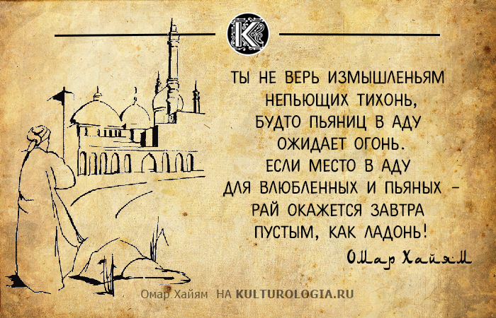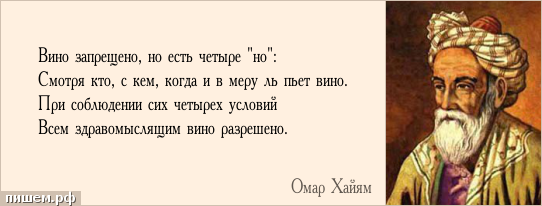 Как-то у него все нескладно получается, особенно в окончании рифмы. :drinks: Похоже действительно знал о чем писал... :tooth:Я взапой могу читать его стихи (Омара Хайяма - имеется в виду). Особенно впечатляют его мудрые мысли о вине и вообще об алкоголе:![]()