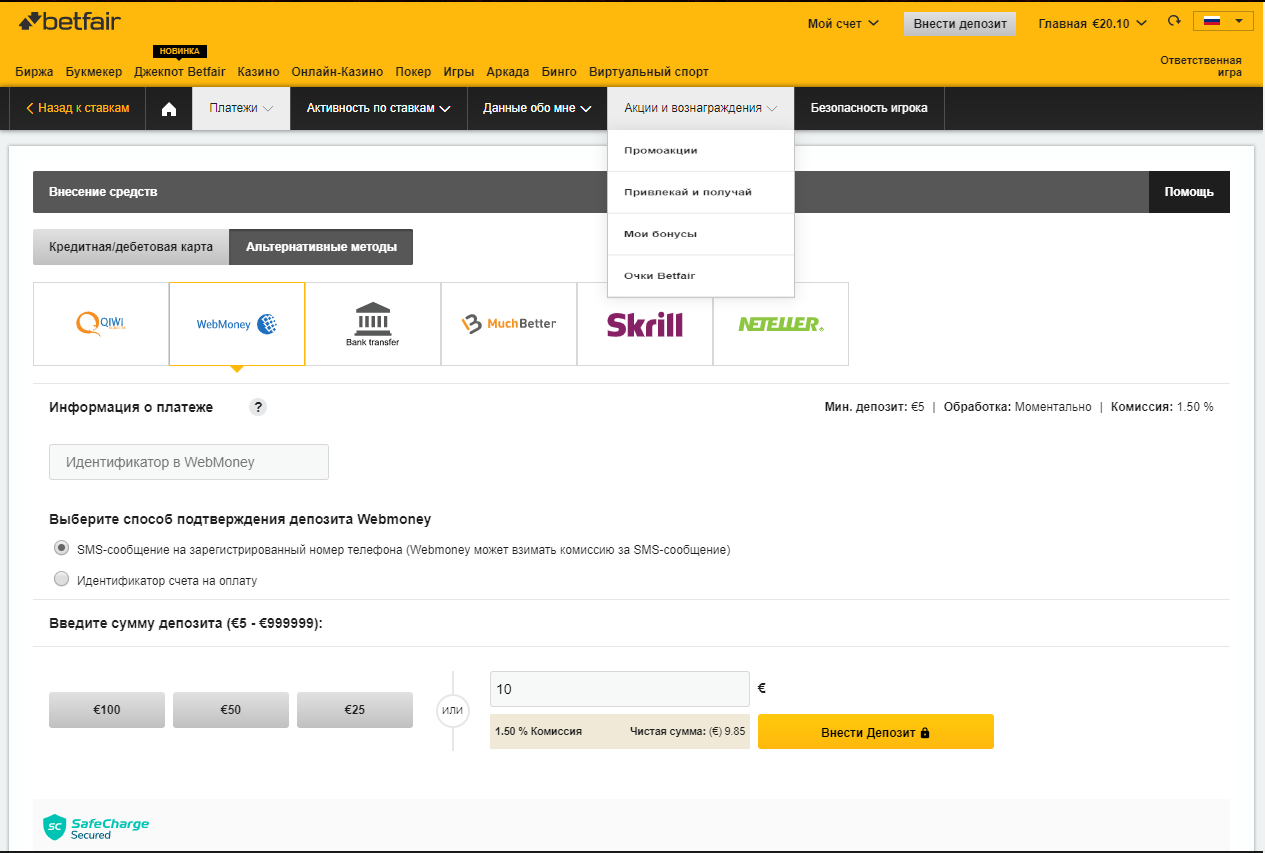 Вот не знаю....в общем дали 10 спинов, набил почти 5 евреев, потом поднял в блэкджеке чуть, дальше не охота, хоть что то бы вывести) Но что бы вывести сказали надо подтвердить платежку, сделать мин. депозит. Самый минимальный на Веб мани, 5 евреев. Кто юзает бетфаир, ничего не попросят более для вывода? Ну может кто и одолжит на вебмани, выведут - отдам. Накину пару сотен. Сам вебмани не использовал, не знаю, WMZ, WMR или без разницы там... И можно ли сразу вывести после депа. а не как в казяках х3 отбивать от депа..?