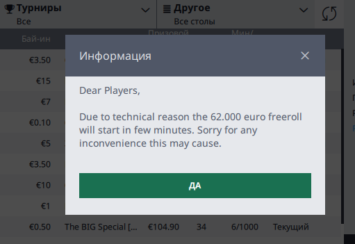 сейчас и в брейкаут пустило,блайнды 250/500 уже,перенесут турнир,на год:tooth: