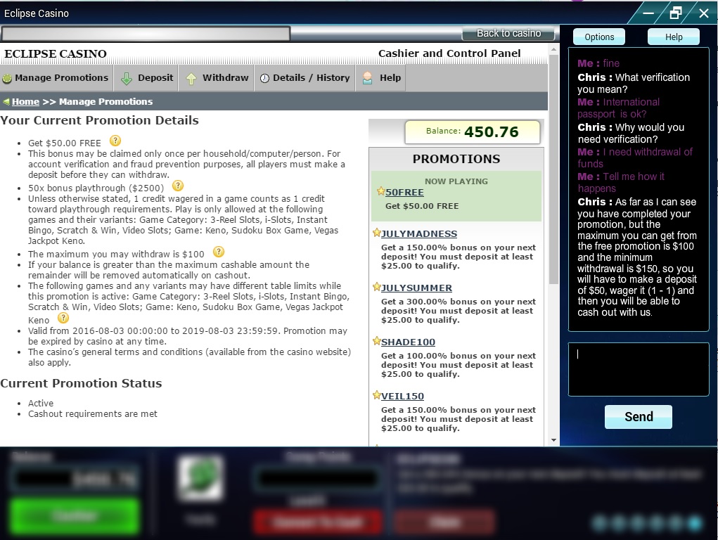 по требованию о снятии выигрыша игрок должен поместить хотя бы один депозит для проверки учетной записи в системе. Список документов, перечисленных на стр. 8 (Процедура снятия денег в онлайн-казино Eclipse) должна быть предоставлена до запроса на снятие. Минимальная сумма снятия составляет 150 долларов США; После этого игроку будет необходимо внести депозит, равный разнице между минимальной суммой вывода и максимальной выпиской из бонуса без депозита (если не указано иное). Размер размещенного вклада дополнительно подлежит ставкам в лицевой сумме депозита, сделанного до запроса на вычет.