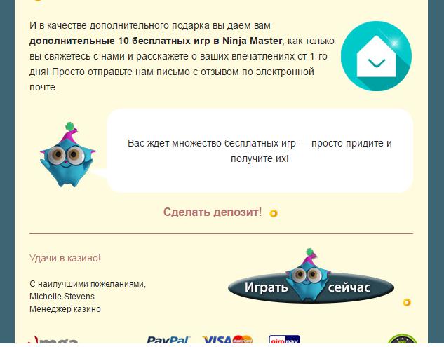 Казино http://www.drueckglueck.com/ru/ русскоязычное все еще раздает бонус новым игрокам 10 фри спинов в нинзя мастере .Вейджер х0. Ну и еще раннее регистрирующиеся смотрите почту мне сегодня пришло письмо напиши отзыв в саппорт и получи еще 10 туда же.