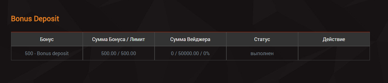 500 - Bonus deposit 500.00 / 500.00 0 / 50000.00 / 0% Активировать