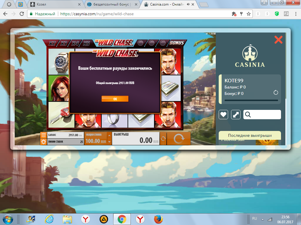 Казино Casynia , даёт 25 фри спинов по ставке 25 рублей в слоте The Wild Chase Бонус код: CHASE вводить при регистрации. Вагер х50. Минимальный депозит: не требуется. Ограничения по странам:Украина. Максимальный вывод (с выигрыша): 5000 руб.