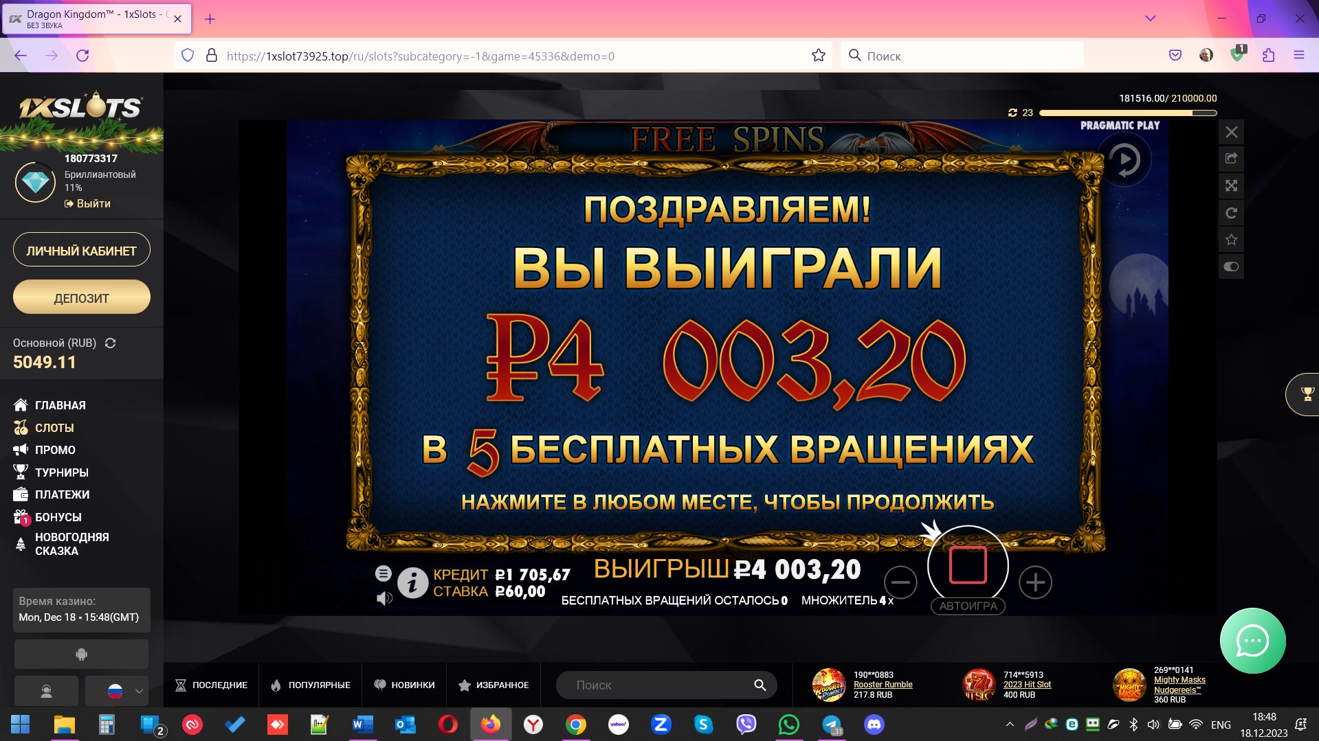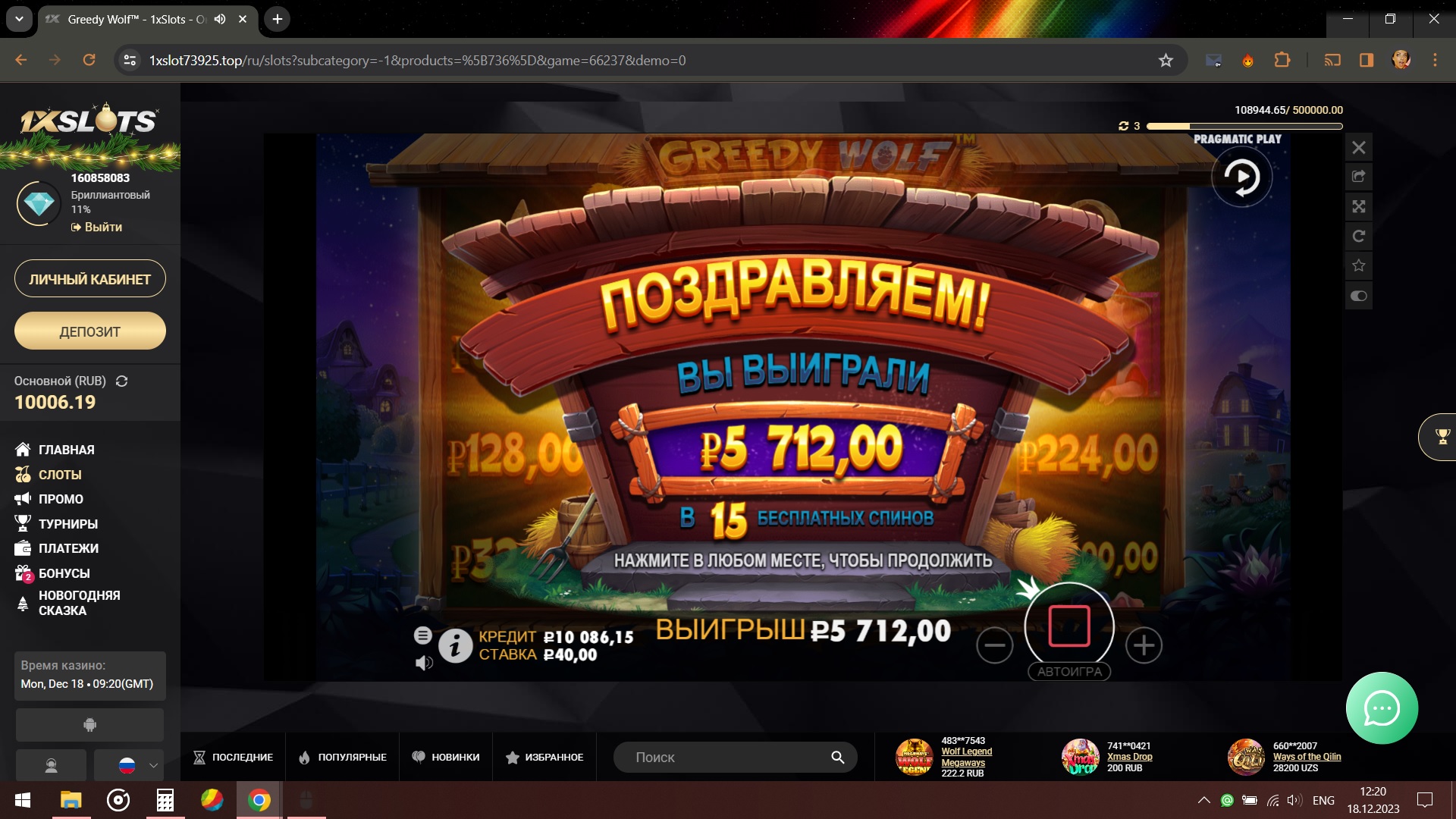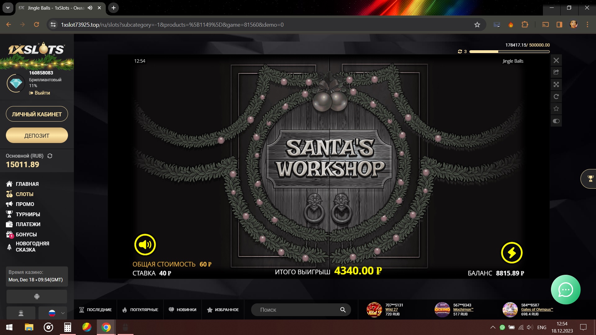 На данный момент больше всего скринов из казино 1xSlots у @columbus_s5 - 185, и у него же больше всего скринов из Unlim Casino - 131.
