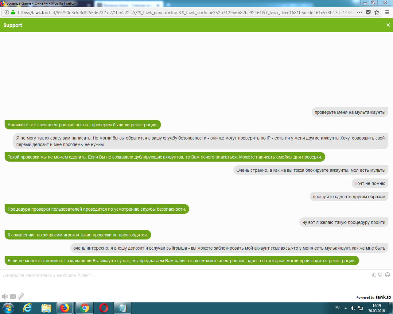 Прошу прощение, но вчера меня немного переполняли эмоции и пост вышел немного неадекватен. Я хочу разобраться, найти справедливость, так как не понимаю почему у меня забрали крупную сумму денег. Я никогда раньше не регистрировалась и не играла на Bonanza game. У меня есть доказательства, что деньги были на счету (скрин). Есть видео большого выигрыша, где видно, что мне выпало 4 символа «WILD», видео снятое на телефон, потому как я увидела что крутит что-то большое, то начала снимать на телефон и когда докрутило до конца, то сама немного была в шоке, что дало такую большую сумму в одном спине(10000$). Я прошу прощение за свои обвинения казино в мошенничестве, я все же предполагаю, что случилась ошибка и хочу выяснить все детали. Хочу, чтобы были предоставлены доказательства (можно в личное сообщение). Но пока не могу выбить вообще никакие объяснение, так как служба поддержки просто меня не понимает и ничего не хотят объяснить. Я могу предоставить все доказательства, что я реальный человек и никогда раньше не регистрировалась на вашем казино. Заходила на аккаунт только со своего компьютера, раньше никто с моего компьютера не играл в казино и я тоже никогда не играла на вашем казино.
