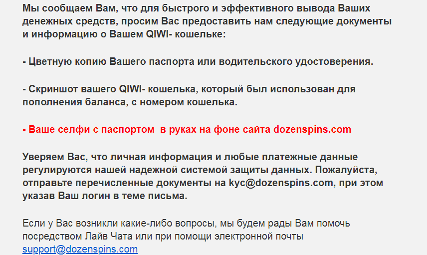 Я делал мин .депозит через киви , предоставил казино документы для верификации . Но это фуфлыжкино казино со мной не рассчиталось и начало вымогать документы по новому скриншоты представлены на этом сайте для публичного просмотра,