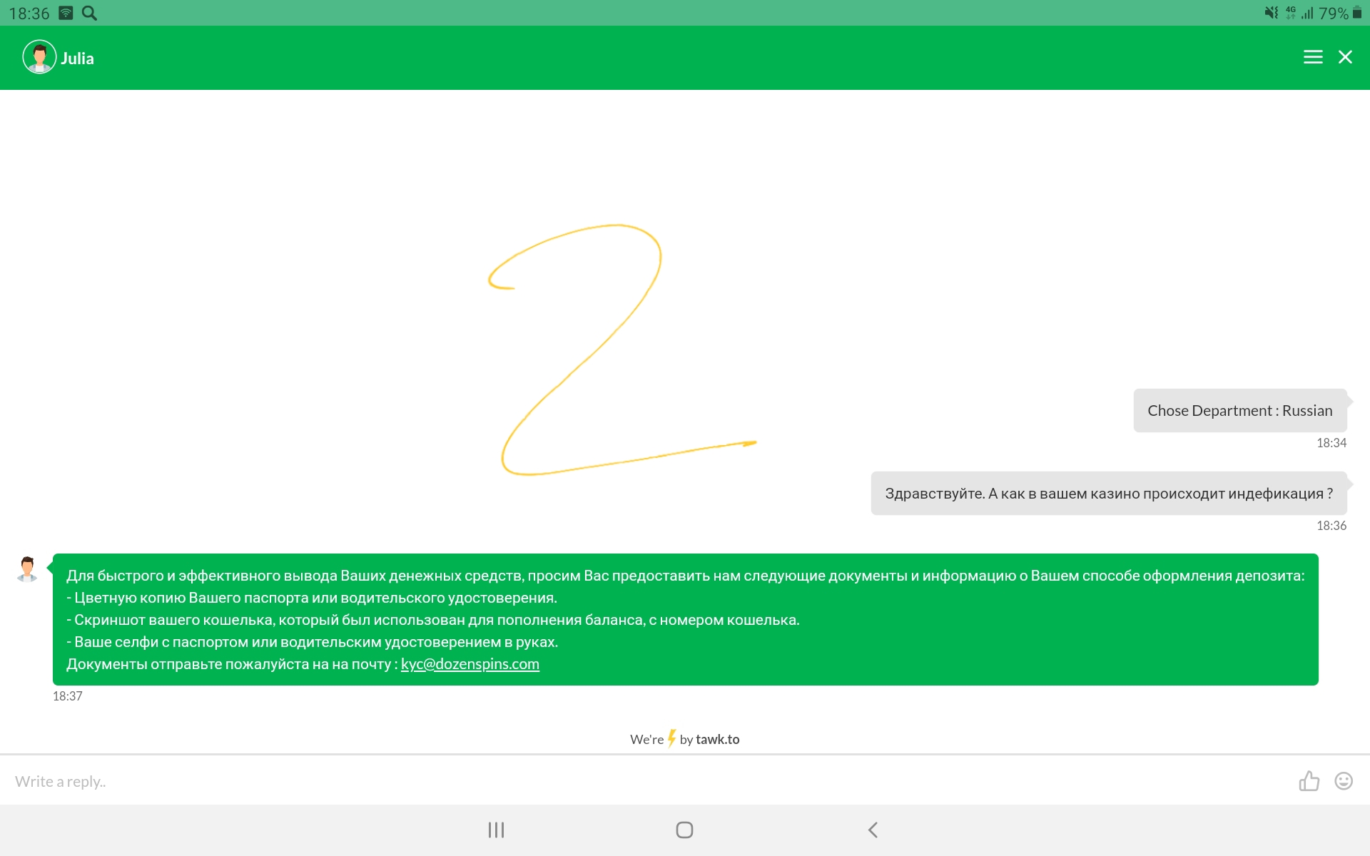 Все документы согласно этому скриншоту были предоставлены немедленно , никаких новых предоставлять не собираюсь. Никаких почтовых адресов ни одному казино не предоставляю вообще Недвижимости не имею и квитанций квартплат как следствие. Селфи на фоне вашего дырявого казино имея единственный планшет сделать вооще не возможно . Разговаривать с фуфел казино культурно пытался первые два дня , наверно зря . Скриншот киви выгруженый на сайт взят изнутри письма отправленно в помойку дозен спин . На нем очень четко виден киви кошелек из которого фуфел казино хавало депозит .