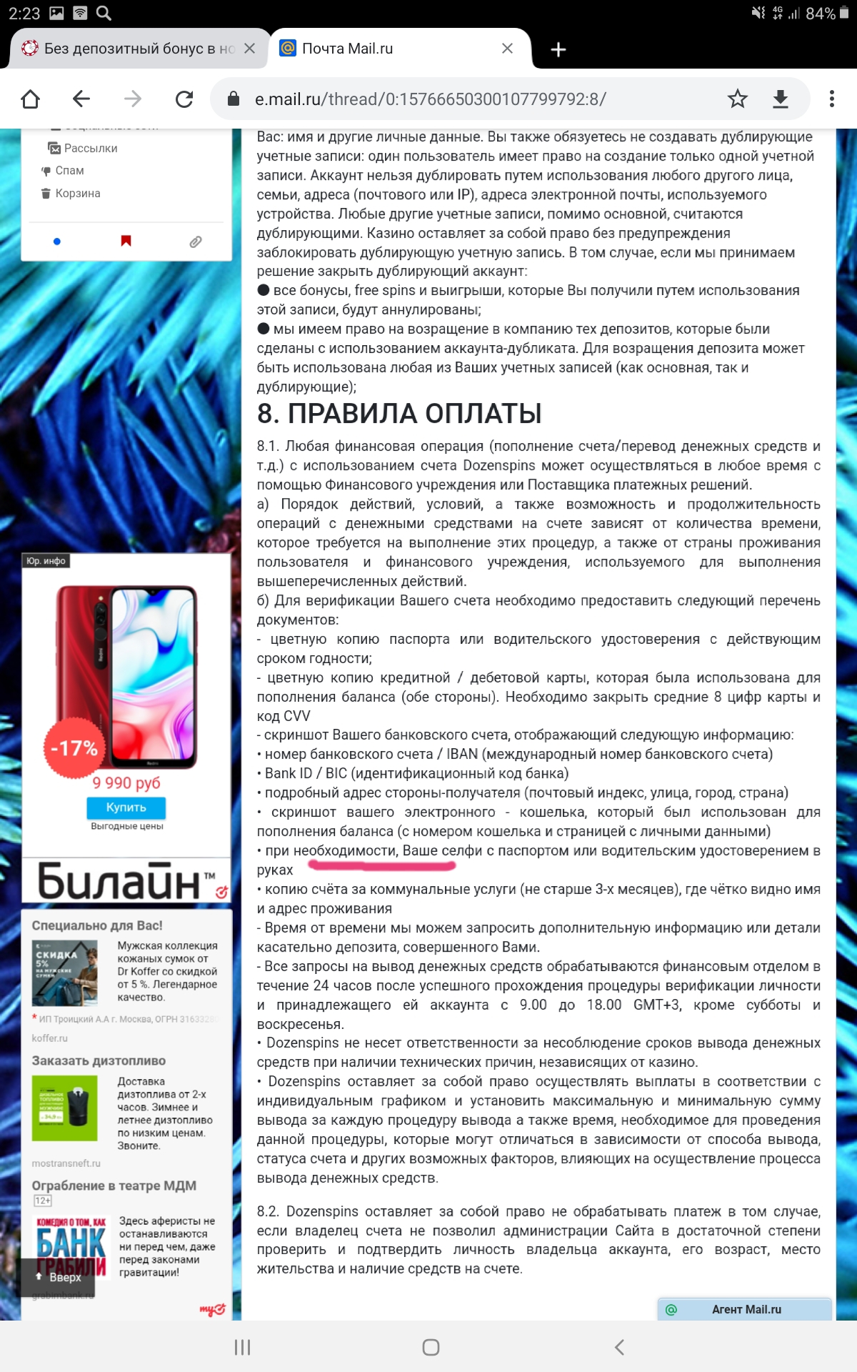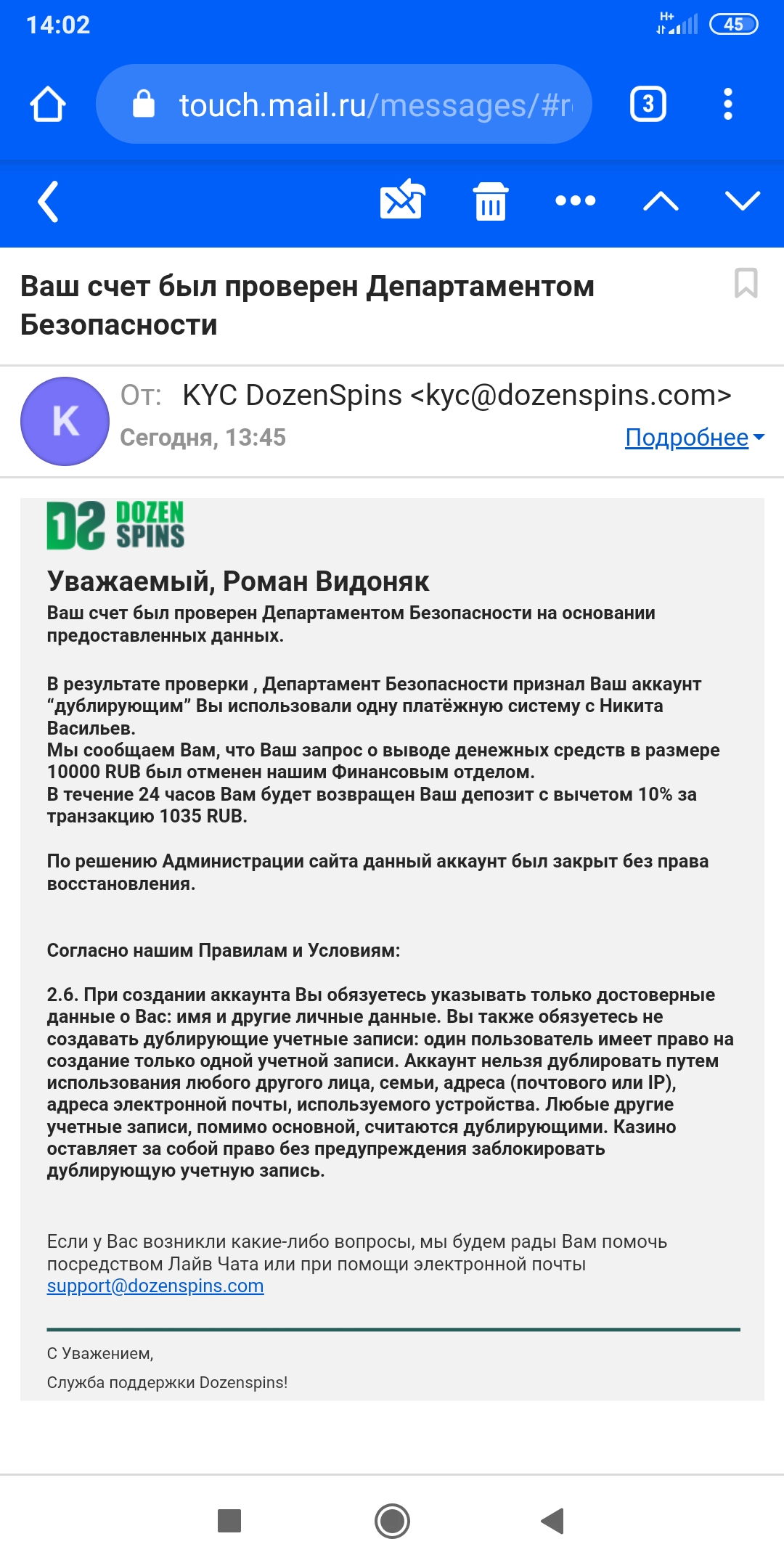 Давольно много казино казино делают выводы до 300$ или 20000 рублей не занимаются хренью с верификацией вообще. А в тех казино в которых я прошёл 150 верификаций адреса и квитанции квартплат некому не нужны. Требование делать фото с паспортом в зубах на фоне сайта вообще уникально . Скриншот одного из писем дозенспина помечено место которое показывает, что дозенспин злоупотребляет своими првилами. Помойней казино в настоящие время найти невозможно.
