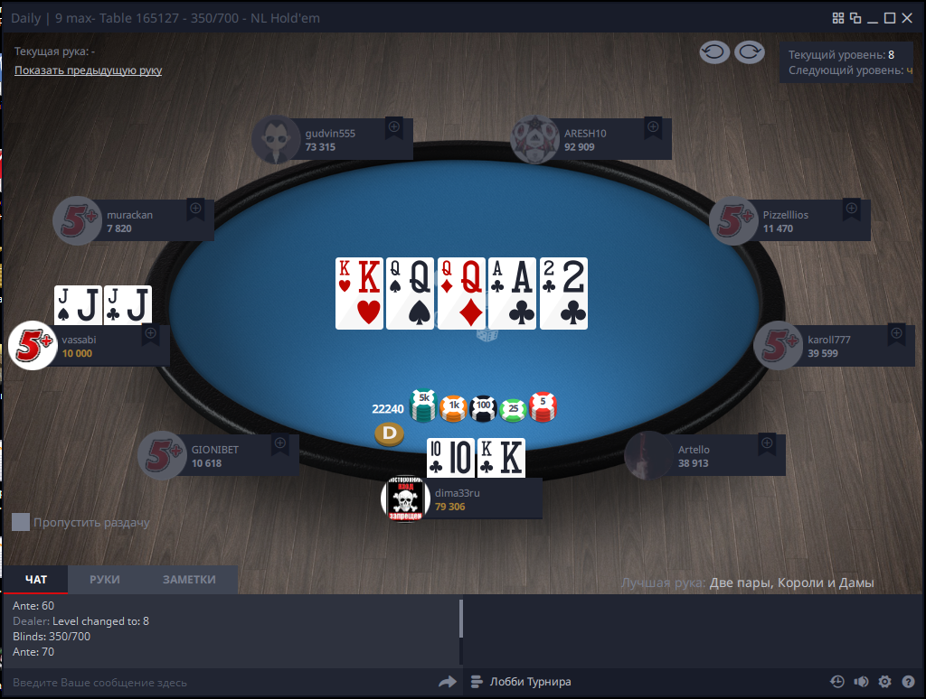 я на 8 месте ужеНа 13 место уже ворвался 1 место приз 260 евро )) Счас им покажу кто ПАпа покера ))