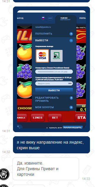 бл*, я думал ты с России... я не так понял) короче, это да, но есть еще кошельки, нужно только вспомнить где гривневый счет есть. Впрочем, есть еще и конвертация валют. То есть, ты выводишь с казино гривин, а приходят рубли (на киви, например). Сам лично так выводил и не раз.да уже больше года ,на вебмани только через впн и то не всегда попадешь