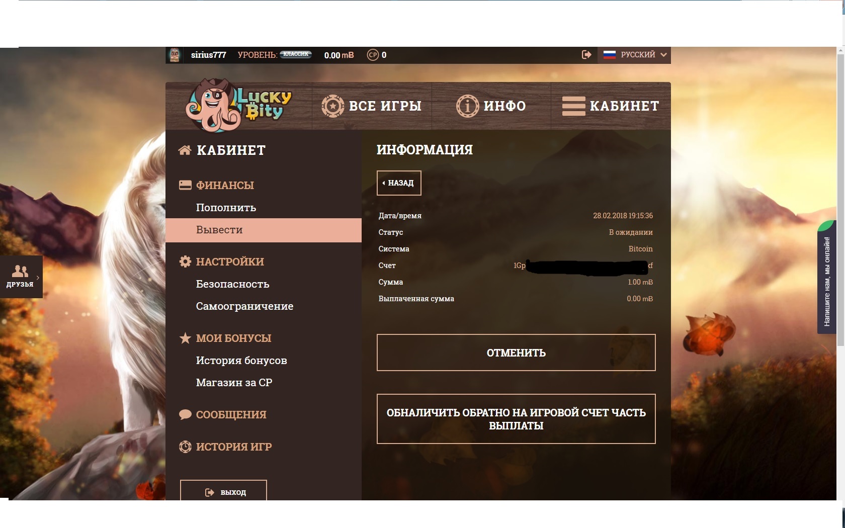 Давал слот каламбус делюкс , сыпал мне как никогда, со счёта сбился сколько раз давал корабли . Когда играл в других казино в каламбуса , так не валило не разу. Бон отбил , на балансе было 120 $ когда отбил. После отбития всё списалось автоматом и остался один 1 микро бтс . Стоит на вывод на биток , в чате не спрашивал потому как в правилах почитал , вывод от нескольких минут до 24 часов , после 6 подтверждений в сети биткоин. В общем как обычно у битка происходит , может вывести за пол часа а может и несколько дней. Как повезётТак что там для вывода деп нужен?