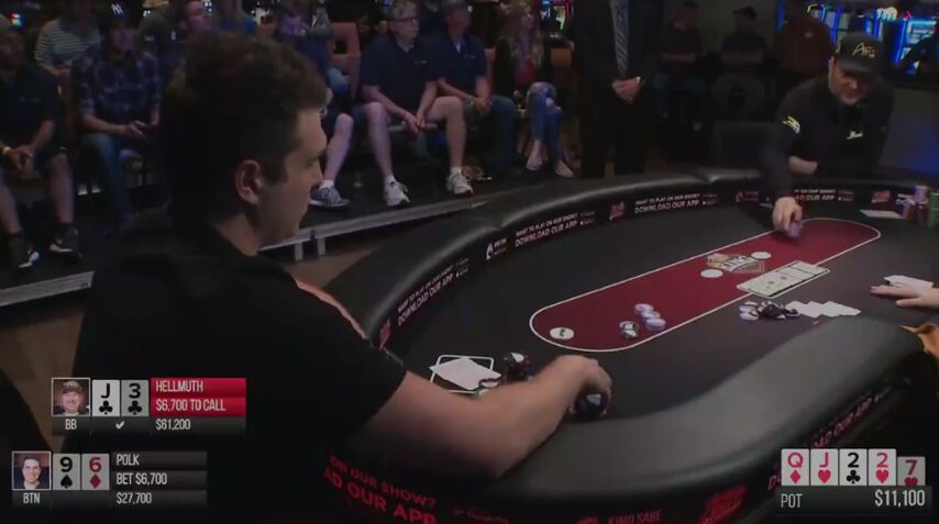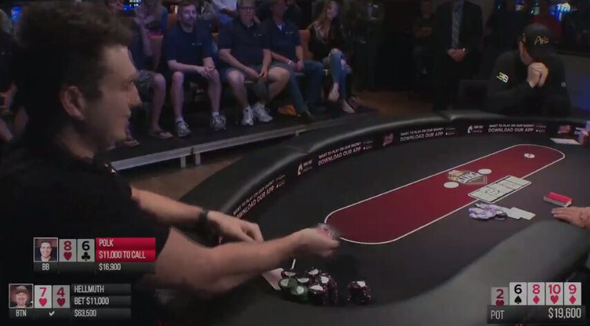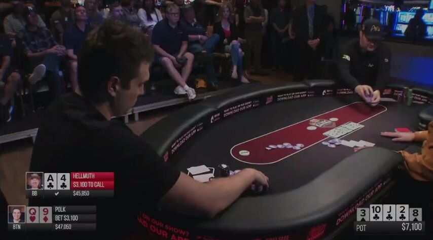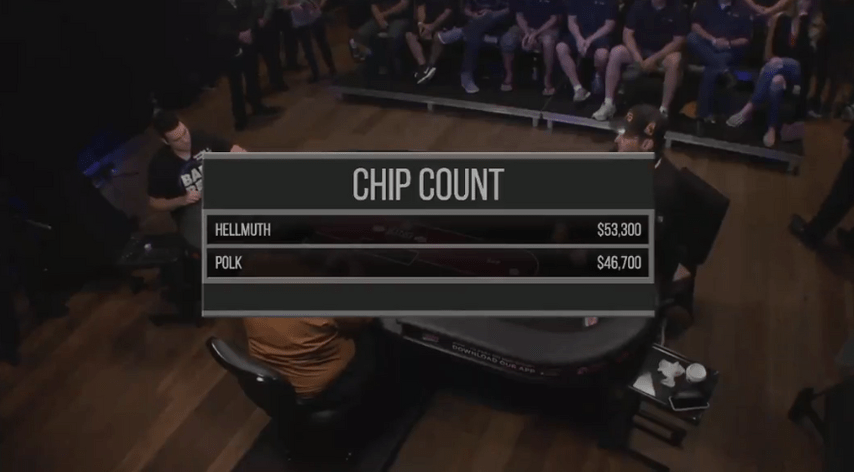 Первая ключевая раздача матча состоялась при практически равном счёте на 51-й минуте. Полк сделал рэйз 1,000 с Qh 9d, Хельмут заколлировал с Ac 4c и заранее прочекал флоп. Открыли Jc Tc 3s.