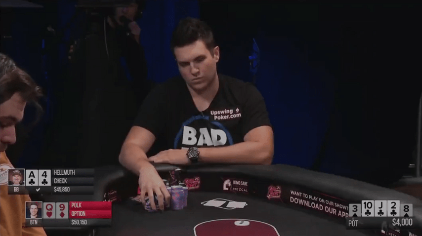 Игра Дага Полка как на префлопе, так и на постфлопе должна быть хорошо знакома тем, кто изучал его чарты стартовых рук и смотрел обучающие видео на Upswingpoker. (В русской версии, если вы ещё не в курсе, Полк разговаривает голосом Ильи Городецкого, и это как минимум весело.) Полярные 3-беты на префлопе, на постфлопе чеки с серединой диапазона, агрессия с верхом и низом, защита от встречной агрессии, основанная на блокерах, и так далее – эдакое «ГТО для чайников», но вполне эффективное. Дважды за матч мы увидели от него овербеты.