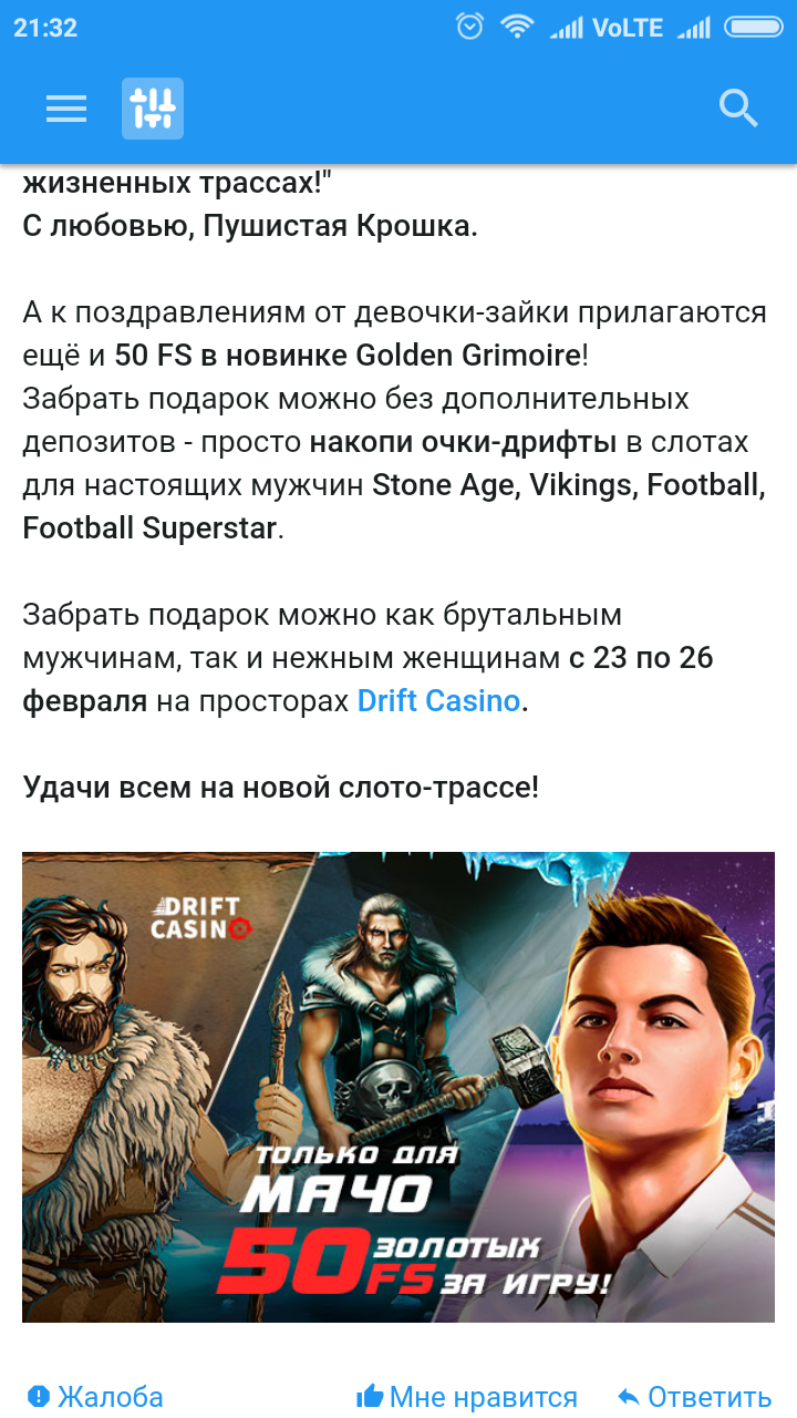 Подарки заряжены на победу с 16 по 19 марта. Забирай фриспины и увози золото! Минимальная сумма депозитов € 50 / 2500 RUB / $50, вейджер х25.