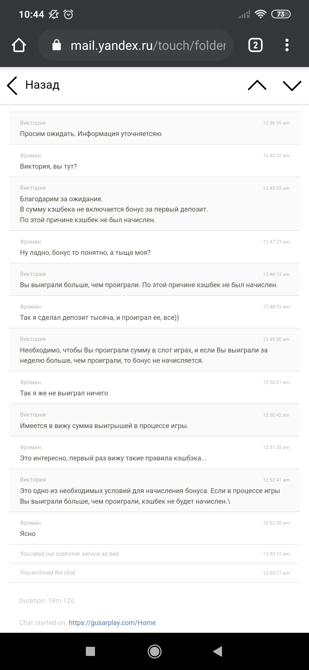 Депнул в ваше казино 1000р под бонус за первый депозит, проиграл. Вспомнил потом, что вроде кэшбэк дают, захожу - кэшбэка нет. Пишу в чат поддержки, а мне такую фигню несут, уши вянут. Оказывается я слил депозит, но я в плюсе, поэтому кэшбэка нет, нонсенс просто😆😆😆.