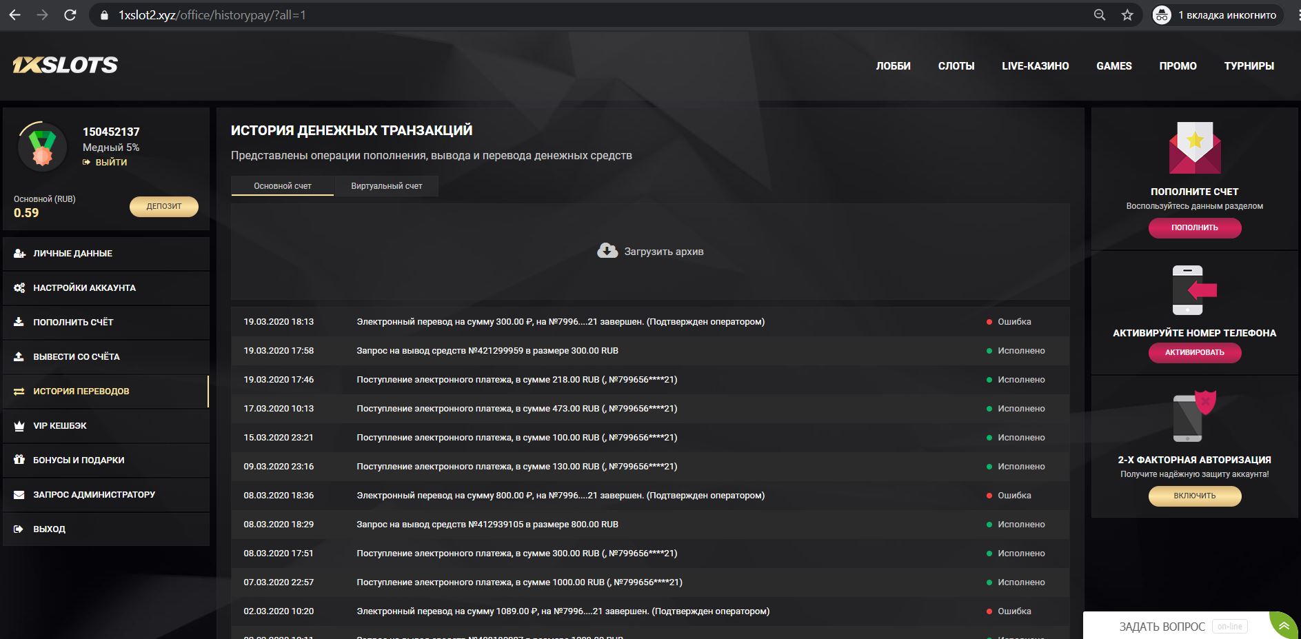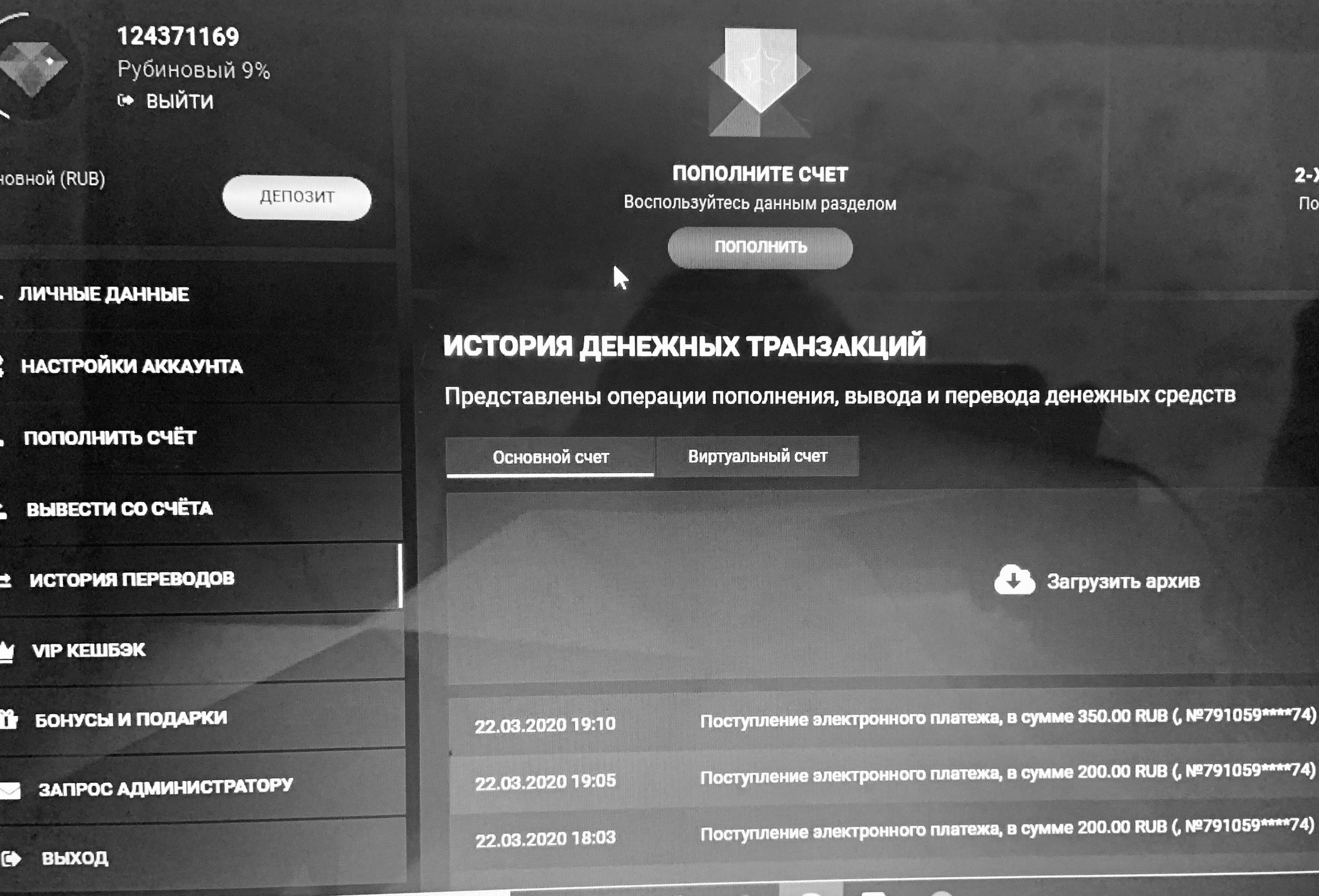 где видно логотип казино, номер счета, дата и сумма депозита и статус платежа Исполнено! С телефона скрины не принимаются, на них не видно номер счета!