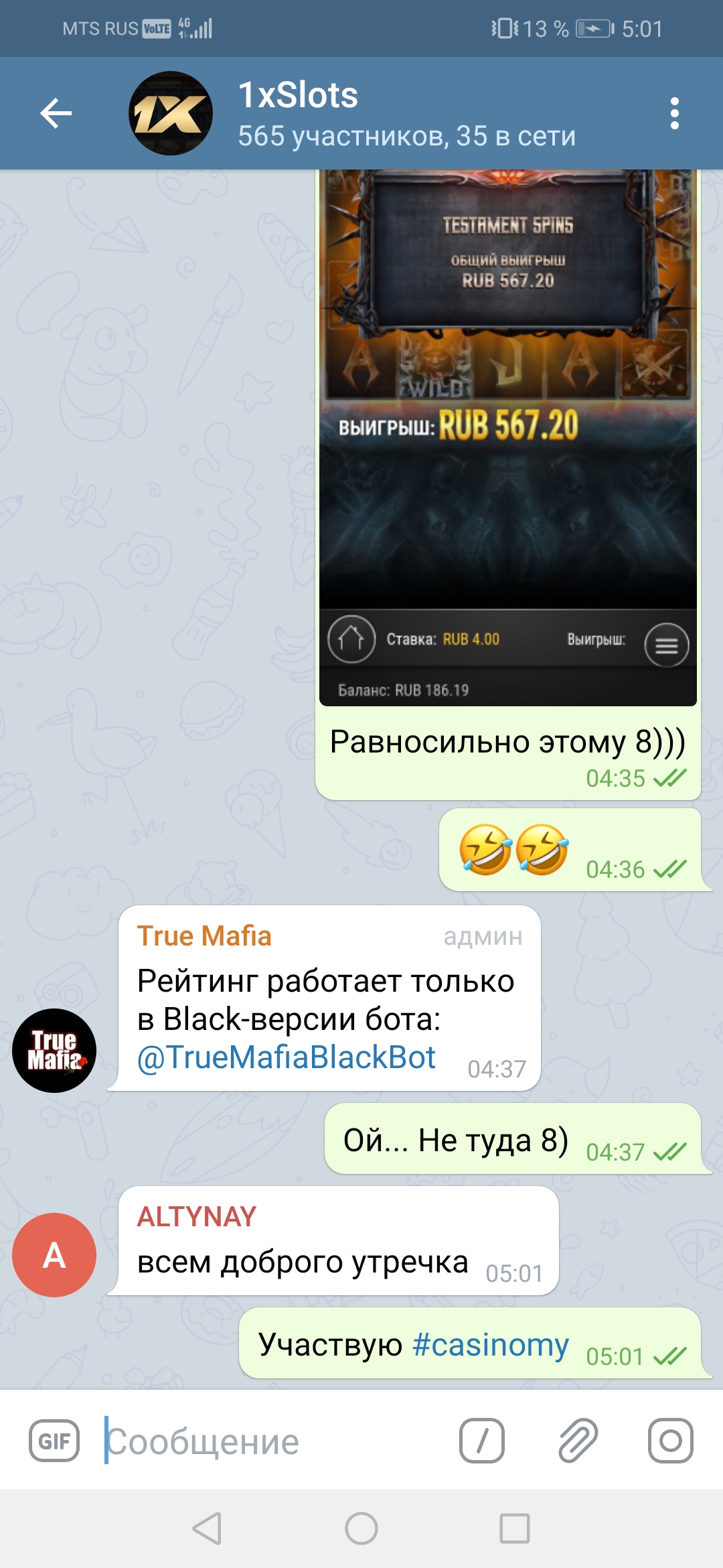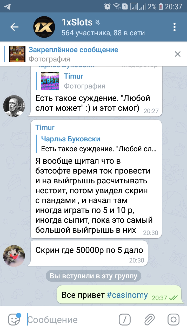 4) Быть подписанным на телеграмм канал казино 1xSlots https://t.me/onexslots и чат https://t.me/xslotschat, в чате написать любое сообщение с тегом #casinomy и разместить текст этого сообщения здесь вместе со скрином депозита.