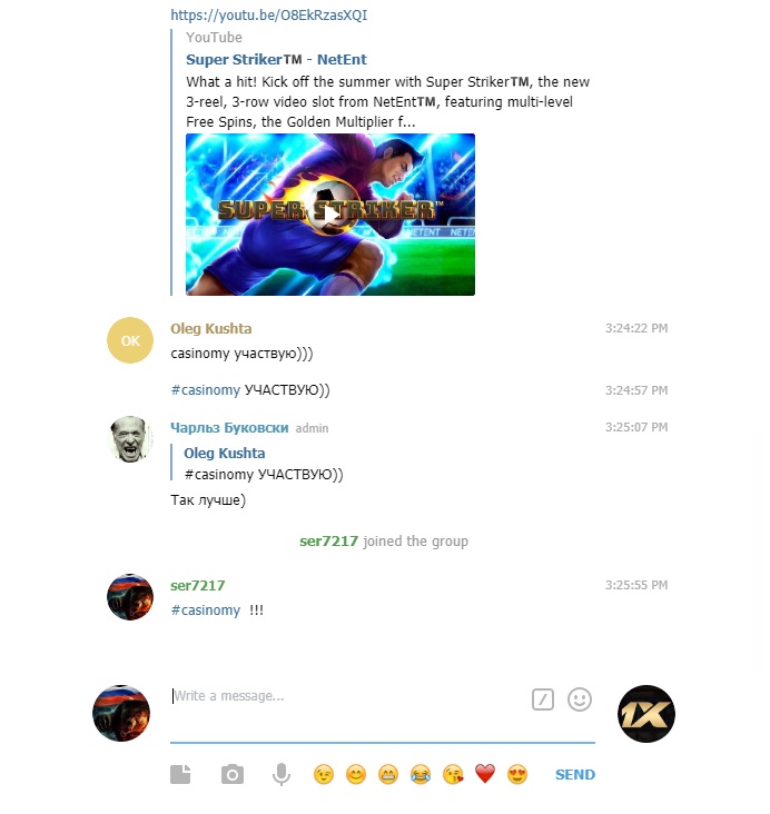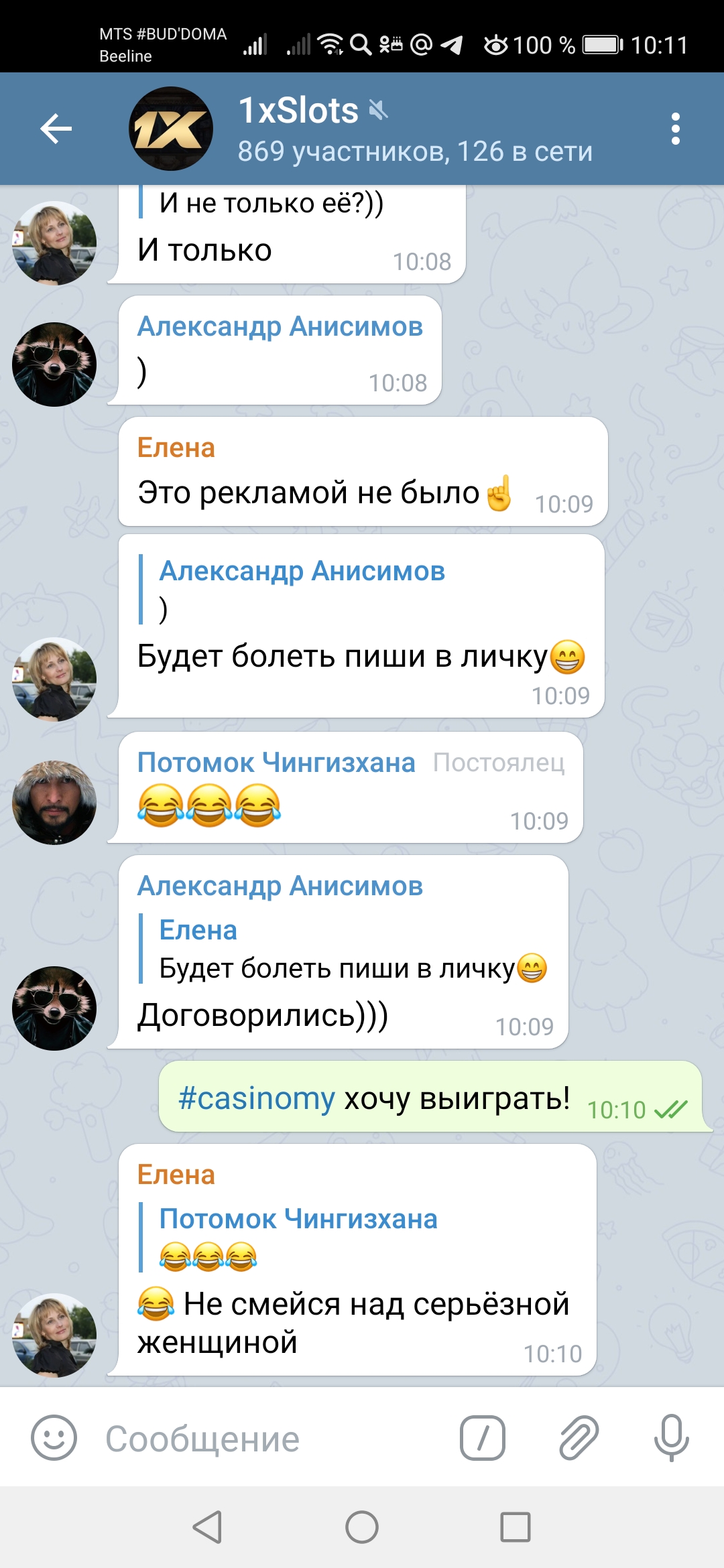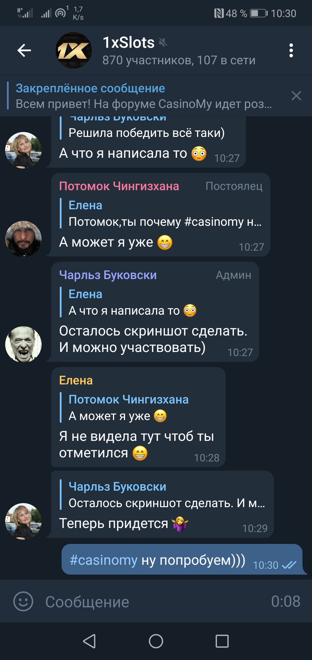 2) Быть подписанным на телеграмм канал казино 1xSlots https://t.me/onexslots и чат https://t.me/xslotschat, в телеграмм чате https://t.me/xslotschat написать любое сообщение с тегом #casinomy и разместить текст этого сообщения в этой теме вместе со скрином депозита.