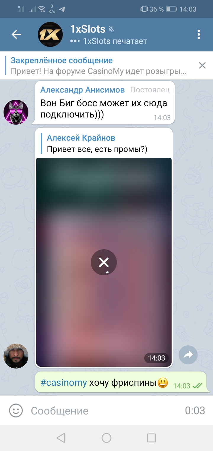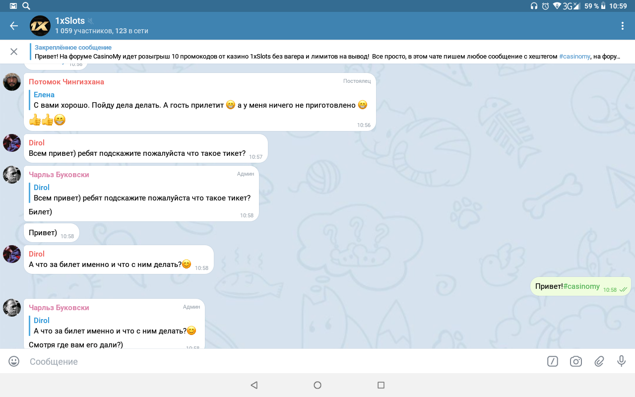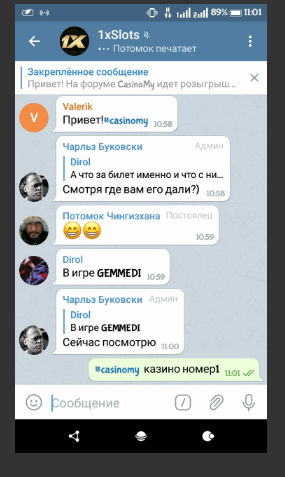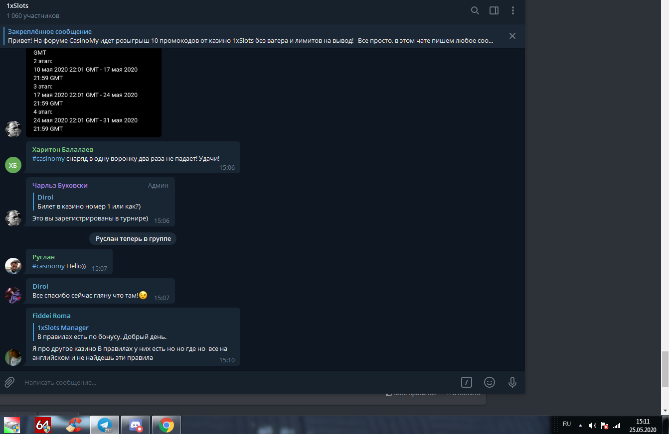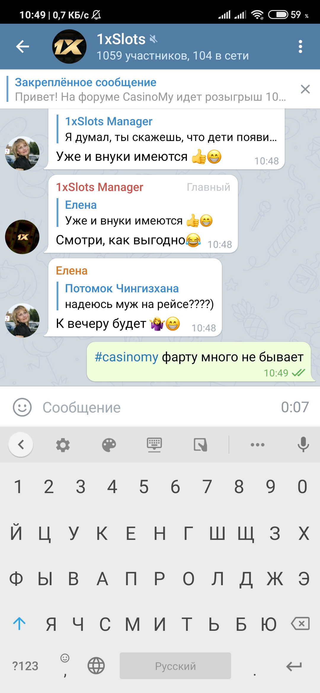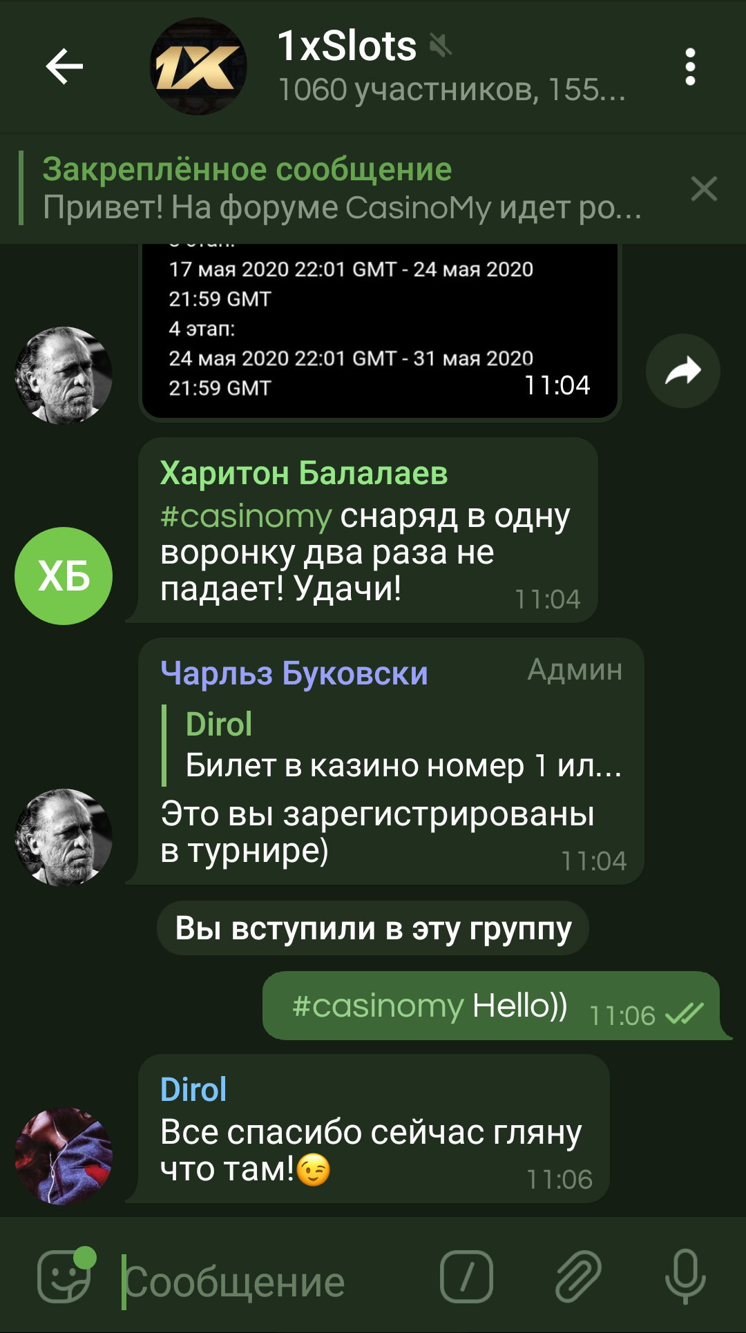 - Быть подписанным на телеграмм канал казино 1xSlots https://t.me/onexslots и чат https://t.me/xslotschat, в телеграмм чате https://t.me/xslotschat написать любое сообщение с тегом #casinomy и разместить текст этого сообщения в этой теме.