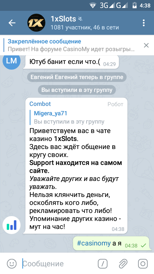 2) Быть подписанным на телеграмм канал казино 1xSlots https://t.me/onexslots и чат https://t.me/xslotschat, в телеграмм чате https://t.me/xslotschat написать любое сообщение с тегом #casinomy и разместить текст этого сообщения в этой теме вместе со скрином депозита.