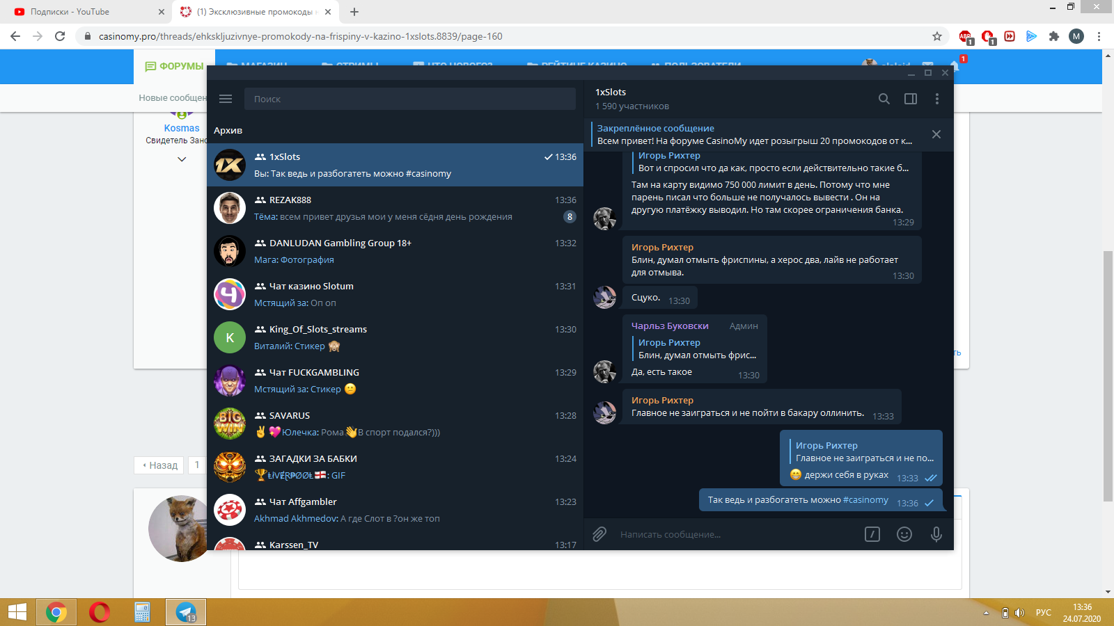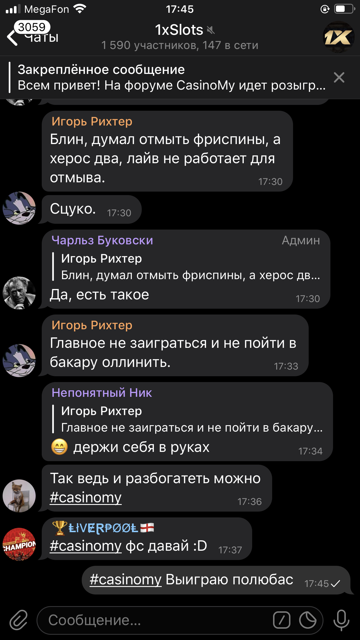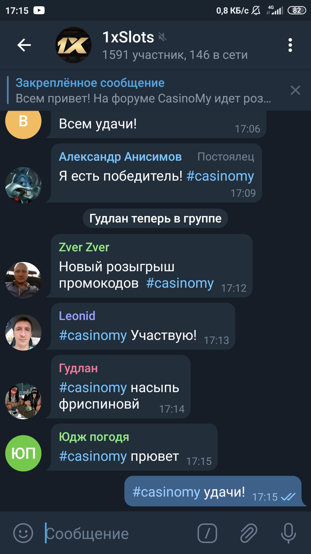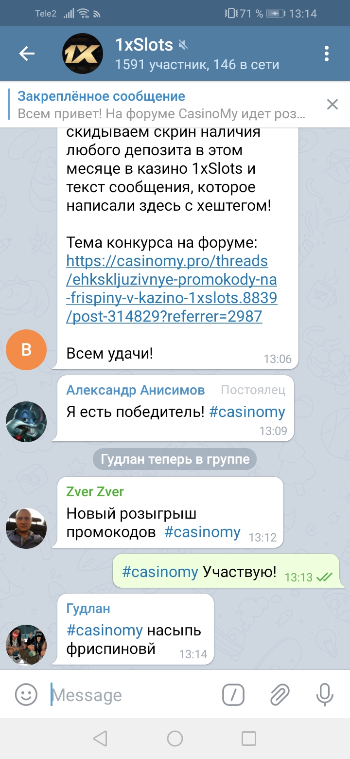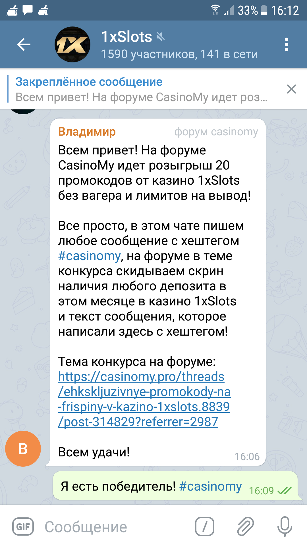 2) Быть подписанным на телеграмм канал казино 1xSlots https://t.me/onexslots и чат https://t.me/xslotschat, в телеграмм чате https://t.me/xslotschat написать любое сообщение с тегом #casinomy и разместить текст этого сообщения в этой теме вместе со скрином депозита.